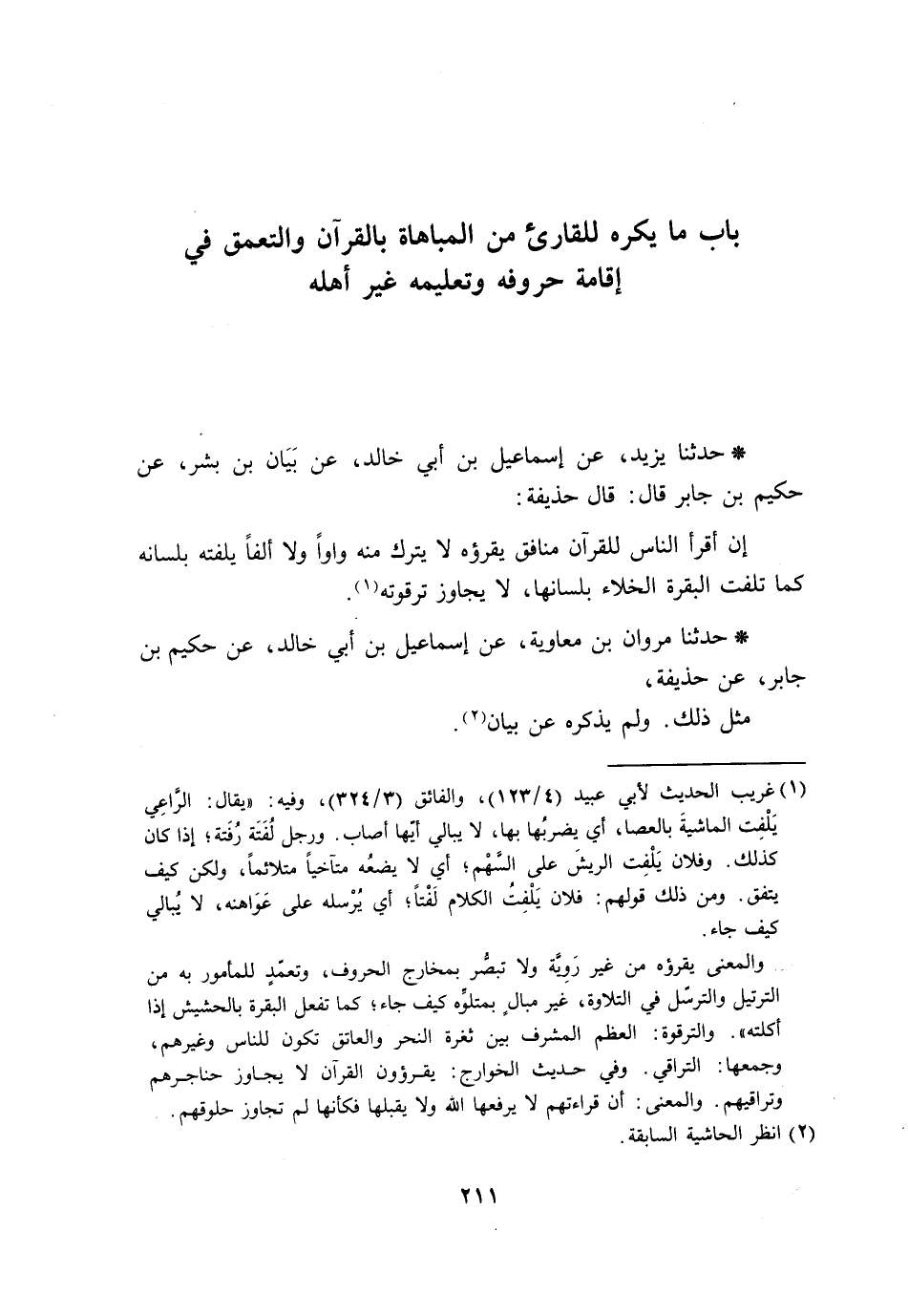 حَدَّثَنَا يَزِيدُ، عَنْ إِسْمَاعِيلَ بْنِ أَبِي خَالِدٍ، عَنْ بَيَانِ بْنِ بِشْرٍ، عَنْ حَكِيمِ بْنِ جَابِرٍ، قَالَ: قَالَ حُذَيْفَةُ: «§إِنَّ أَقْرَأَ النَّاسِ لِلْقُرْآنِ مُنَافِقٌ يَقْرَؤُهُ لَا يَتْرُكُ مِنْهُ وَاوًا وَلَا أَلِفًا يَلْفِتُهُ بِلِسَانِهِ كَمَا تَلْفِتُ الْبَقَرَةُ الْخَلَاءَ بِلِسَانِهَا، لَا يُجَاوِزُ تَرْقُوَتَهُ» حَدَّثَنَا مَرْوَانُ بْنُ مُعَاوِيَةَ، عَنْ إِسْمَاعِيلَ بْنِ أَبِي خَالِدٍ، عَنْ حَكِيمِ بْنِ جَابِرٍ، عَنْ حُذَيْفَةَ، مِثْلَ ذَلِكَ. وَلَمْ يَذْكُرْهُ عَنْ بَيَانٍ