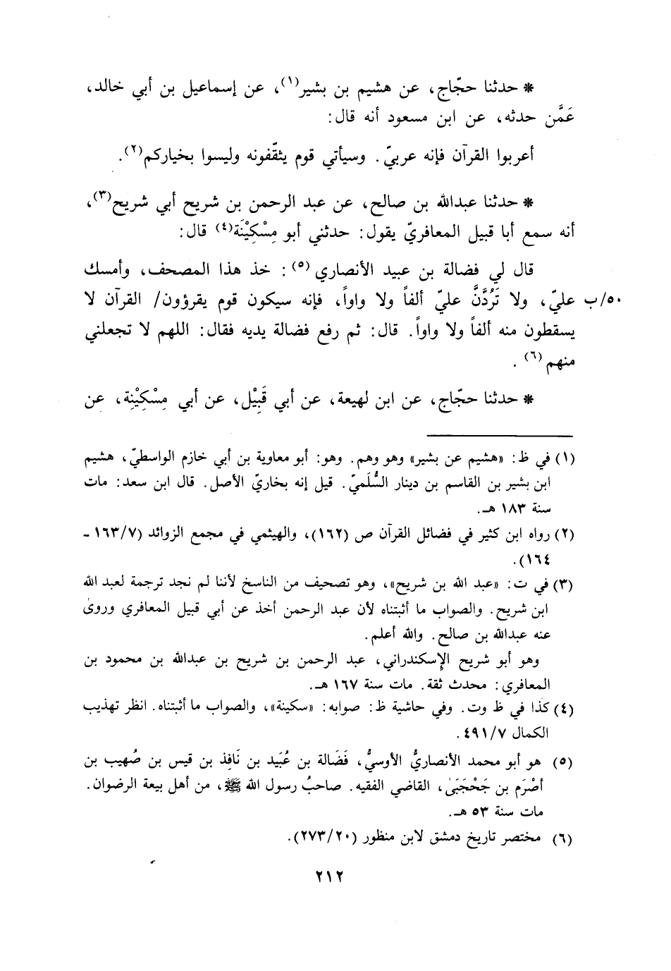 حَدَّثَنَا عَبْدُ اللَّهِ بْنُ صَالِحٍ، عَنْ عَبْدِ الرَّحْمَنِ بْنِ شُرَيْحٍ أَبِي شُرَيْحٍ، أَنَّهُ سَمِعَ أَبَا قَبِيلٍ الْمَعَافِرِيِّ، يَقُولُ: حَدَّثَنِي أَبُو مِسْكِينَةَ، قَالَ: قَالَ لِي فَضَالَةُ بْنُ عُبَيْدٍ الْأَنْصَارِيُّ: " §خُذْ هَذَا الْمُصْحَفَ، وَأَمْسِكْ عَلَيَّ، وَلَا تَرُدَّنَّ عَلَيَّ أَلِفًا وَلَا وَاوًا، فَإِنَّهُ سَيَكُونُ قَوْمٌ يَقْرَءُونَ الْقُرْآنَ لَا يُسْقِطُونَ مِنْهُ أَلِفًا وَلَا وَاوًا. قَالَ: ثُمَّ رَفَعَ فَضَالَةُ يَدَيْهِ فَقَالَ: «اللَّهُمَّ لَا تَجْعَلْنِي مِنْهُمْ» حَدَّثَنَا حَجَّاجٌ، عَنِ ابْنِ لَهِيعَةَ، عَنْ أَبِي قَبِيلٍ، عَنْ أَبِي مِسْكِينَةَ، -[213]- عَنْ فَضَالَةَ بْنِ عُبَيْدٍ، مِثْلَ ذَلِكَ إِلَّا أَنَّهُ قَالَ: «لَا تَأْخُذَنَّ عَلَيَّ حَرْفًا إِلَّا آيَةً كَامِلَةً»