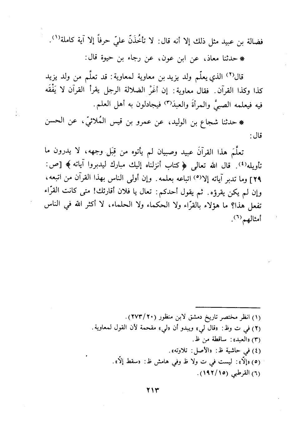 حَدَّثَنَا مُعَاذٌ، عَنِ ابْنِ عَوْنٍ، عَنْ رَجَاءِ بْنِ حَيْوَةَ، قَالَ: قَالَ الَّذِي يُعَلِّمُ وَلَدَ يَزِيدَ بْنِ مُعَاوِيَةَ لِمُعَاوِيَةَ: قَدْ تَعَلَّمَ مِنْ وَلَدِ يَزِيدَ كَذَا وَكَذَا الْقُرْآنَ. فَقَالَ مُعَاوِيَةُ: «§إِنَّ أَغَرَّ الضَّلَالَةِ الرَّجُلُ يَقْرَأُ الْقُرْآنَ لَا يَفْقَهُ فِيهِ، فَيُعَلِّمُهُ الصَّبِيُّ وَالْمَرْأَةُ وَالْعَبْدُ، فَيُجَادِلُونَ بِهِ أَهْلَ الْعِلْمِ»