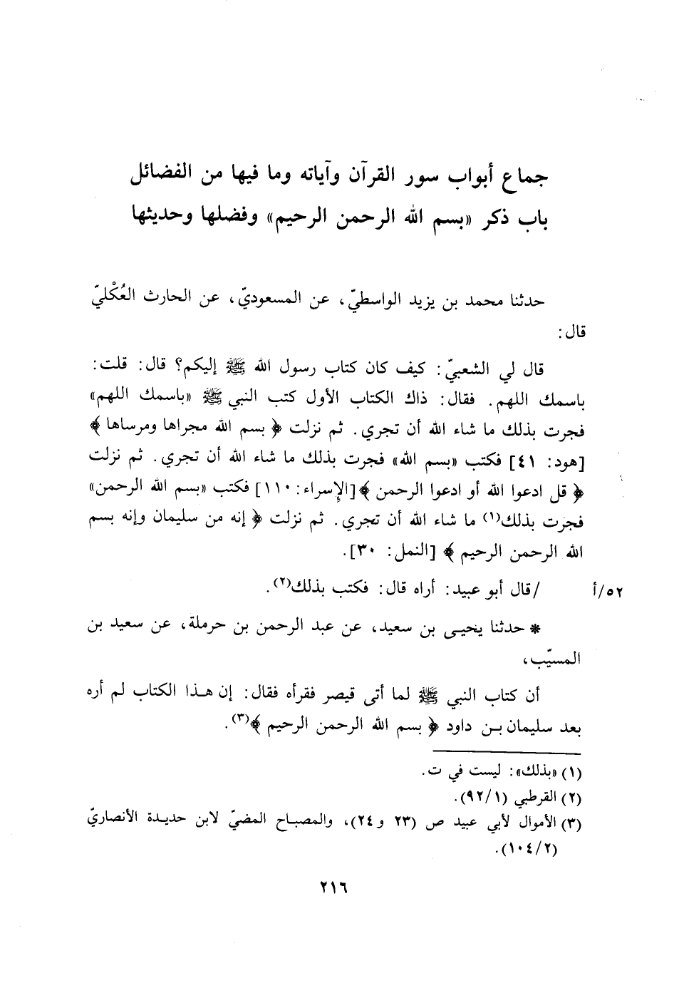 حَدَّثَنَا مُحَمَّدُ بْنُ يَزِيدَ الْوَاسِطِيُّ، عَنِ الْمَسْعُودِيِّ، عَنِ الْحَارِثِ الْعُكْلِيِّ، قَالَ: قَالَ لِي الشَّعْبِيُّ: كَيْفَ كَانَ كِتَابُ رَسُولِ اللَّهِ صَلَّى اللَّهُ عَلَيْهِ وَسَلَّمَ إِلَيْكُمْ؟ قَالَ: قُلْتُ: بِاسْمِكَ اللَّهُمَّ. فَقَالَ: «§ذَاكَ الْكِتَابُ الْأَوَّلُ كَتَبَ النَّبِيُّ صَلَّى اللَّهُ عَلَيْهِ وَسَلَّمَ» بِاسْمِكَ اللَّهُمَّ " فَجَرَتْ بِذَلِكَ مَا شَاءَ اللَّهُ أَنْ تَجْرِي، ثُمَّ نَزَلَتْ {بِسْمِ اللَّهِ مَجْرَاهَا وَمُرْسَاهَا} [هود: 41] فَكَتَبَ «بِسْمِ اللَّهِ» فَجَرَتْ بِذَلِكَ مَا شَاءَ اللَّهُ أَنْ تَجْرِي، ثُمَّ نَزَلَتْ {قُلِ ادْعُوا اللَّهَ أَوِ ادْعُوا الرَّحْمَنَ} [الإسراء: 110] فَكَتَبَ «بِسْمِ اللَّهِ الرَّحْمَنِ» فَجَرَتْ بِذَلِكَ مَا شَاءَ اللَّهُ أَنْ تَجْرِي، ثُمَّ نَزَلَتْ {إِنَّهُ مِنْ سُلَيْمَانَ وَإِنَّهُ بِسْمِ اللَّهِ الرَّحْمَنِ الرَّحِيمِ} [النمل: 30] ". قَالَ أَبُو عُبَيْدٍ: أُرَاهُ قَالَ: «فَكَتَبَ بِذَلِكَ»