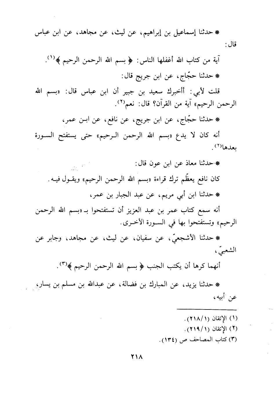 حَدَّثَنَا حَجَّاجٌ، عَنِ ابْنِ جُرَيْجٍ، عَنْ نَافِعٍ، عَنِ ابْنِ عُمَرَ، §أَنَّهُ كَانَ لَا يَدَعُ {بِسْمِ اللَّهِ الرَّحْمَنِ الرَّحِيمِ} [الفاتحة: 1] حَتَّى يَسْتَفْتِحَ السُّورَةَ بَعْدَهَا