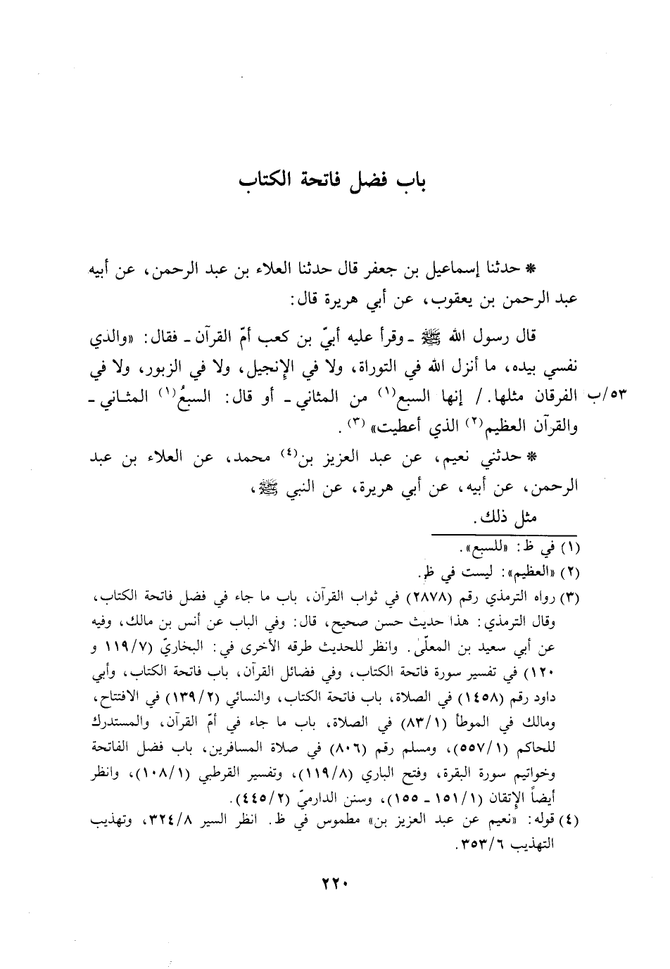 حَدَّثَنَا إِسْمَاعِيلُ بْنُ جَعْفَرٍ، قَالَ: حَدَّثَنَا الْعَلَاءُ بْنُ عَبْدِ الرَّحْمَنِ، عَنْ أَبِيهِ عَبْدِ الرَّحْمَنِ بْنِ يَعْقُوبَ، عَنْ أَبِي هُرَيْرَةَ، قَالَ: قَالَ رَسُولُ اللَّهِ صَلَّى اللَّهُ عَلَيْهِ وَسَلَّمَ وَقَرَأَ عَلَيْهِ أُبَيُّ بْنُ كَعْبٍ أُمَّ الْقُرْآنِ فَقَالَ: «وَالَّذِي نَفْسِي بِيَدِهِ، §مَا أَنْزَلَ اللَّهُ فِي التَّوْرَاةِ، وَلَا فِي الْإِنْجِيلِ، وَلَا فِي الزَّبُورِ، وَلَا فِي الْفُرْقَانِ مِثْلَهَا إِنَّهَا السَّبْعُ مِنَ الْمَثَانِي» . أَوْ قَالَ: «السَّبْعُ الْمَثَانِي وَالْقُرْآنُ الْعَظِيمُ الَّذِي أُعْطِيتُ» . حَدَّثَنِي نُعَيْمٌ، عَنْ عَبْدِ الْعَزِيزِ بْنِ مُحَمَّدٍ، عَنِ الْعَلَاءِ بْنِ عَبْدِ الرَّحْمَنِ، عَنْ أَبِيهِ، عَنْ أَبِي هُرَيْرَةَ، عَنِ النَّبِيِّ صَلَّى اللَّهُ عَلَيْهِ وَسَلَّمَ، مِثْلَ ذَلِكَ. -[221]- وَحَدَّثَنِي ابْنُ أَبِي مَرْيَمَ، وَإِسْحَاقُ بْنُ عِيسَى، عَنْ مَالِكِ بْنِ أَنَسٍ، عَنِ الْعَلَاءِ بْنِ عَبْدِ الرَّحْمَنِ، أَنَّ أَبَا سَعِيدٍ مَوْلَى عَامِرِ بْنِ كَرِيزٍ أَخْبَرَهُ عَنِ النَّبِيِّ صَلَّى اللَّهُ عَلَيْهِ وَسَلَّمَ وَأُبَيِّ بْنِ كَعْبٍ، مِثْلَ ذَلِكَ حَدَّثَنِي حَجَّاجٌ، عَنِ ابْنِ جُرَيْجٍ، قَالَ: أَخْبَرَنِي عَبْدُ اللَّهِ بْنُ أَبِي بَكْرِ بْنِ حَزْمٍ، عَنِ الْعَلَاءِ بْنِ عَبْدِ الرَّحْمَنِ، عَنِ النَّبِيِّ صَلَّى اللَّهُ عَلَيْهِ وَسَلَّمَ مِثْلَ ذَلِكَ. حَدَّثَنَا يَزِيدُ، عَنْ مُحَمَّدِ بْنِ إِسْحَاقَ، عَنِ الْعَلَاءِ بْنِ عَبْدِ الرَّحْمَنِ، عَنِ النَّبِيِّ صَلَّى اللَّهُ عَلَيْهِ وَسَلَّمَ، مِثْلَ ذَلِكَ حَدَّثَنَا عَبْدُ اللَّهِ بْنُ صَالِحٍ، عَنِ اللَّيْثِ، عَنْ مُحَمَّدِ بْنِ عَجْلَانَ، عَنِ الْعَلَاءِ بْنِ عَبْدِ الرَّحْمَنِ، عَنِ النَّبِيِّ صَلَّى اللَّهُ عَلَيْهِ وَسَلَّمَ، مِثْلَ ذَلِكَ أَيْضًا. قَالَ أَبُو عُبَيْدٍ: لَمْ يُسْنِدْهُ ابْنُ جُرَيْجٍ وَابْنُ إِسْحَاقَ وَابْنُ عَجْلَانَ، وَأَسْنَدَهُ إِسْمَاعِيلُ بْنُ جَعْفَرٍ وَعَبْدُ الْعَزِيزِ، وَخَالَفَهُمَا مَالِكٌ فِي الْإِسْنَادِ