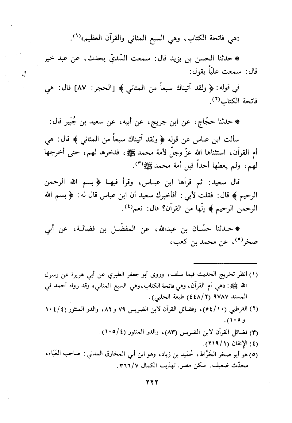 حَدَّثَنَا الْحَسَنُ بْنُ يَزِيدَ، قَالَ: سَمِعْتُ السُّدِّيَّ، يُحَدِّثُ عَنْ عَبْدِ خَيْرٍ، قَالَ: سَمِعْتُ عَلِيًّا يَقُولُ: فِي قَوْلِهِ: {وَلَقَدْ آتَيْنَاكَ سَبْعًا مِنَ الْمَثَانِي} [الحجر: 87] قَالَ: «§هِيَ فَاتِحَةُ الْكِتَابِ»