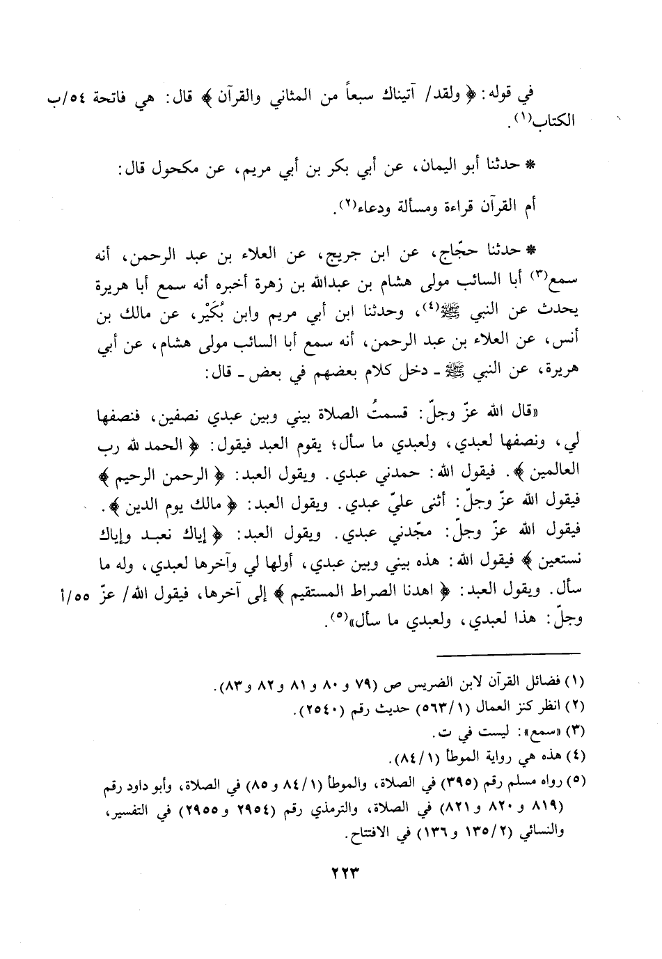 حَدَّثَنَا حَجَّاجٌ، عَنِ ابْنِ جُرَيْجٍ، عَنِ الْعَلَاءِ بْنِ عَبْدِ الرَّحْمَنِ، أَنَّهُ سَمِعَ أَبَا السَّائِبِ مَوْلَى هِشَامِ بْنِ عَبْدِ اللَّهِ بْنِ زُهْرَةَ، أَخْبَرَهُ أَنَّهُ سَمِعَ أَبَا هُرَيْرَةَ، يُحَدِّثُ عَنِ النَّبِيِّ صَلَّى اللَّهُ عَلَيْهِ وَسَلَّمَ، وَحَدَّثَنَا ابْنُ أَبِي مَرْيَمَ، وَابْنُ بُكَيْرٍ، عَنْ مَالِكِ بْنِ أَنَسٍ، عَنِ الْعَلَاءِ بْنِ عَبْدِ الرَّحْمَنِ، أَنَّهُ سَمِعَ أَبَا السَّائِبِ مَوْلَى هِشَامٍ، عَنْ أَبِي هُرَيْرَةَ، عَنِ النَّبِيِّ صَلَّى اللَّهُ عَلَيْهِ وَسَلَّمَ دَخَلَ كَلَامُ بَعْضِهِمْ فِي بَعْضٍ قَالَ: " قَالَ اللَّهُ عَزَّ وَجَلَّ: §قَسَمْتُ الصَّلَاةَ بَيْنِي وَبَيْنَ عَبْدِي نِصْفَيْنِ: فَنِصْفُهَا لِي، وَنِصْفُهَا لِعَبْدِي، وَلِعَبْدِي مَا سَأَلَ؛ يَقُومُ الْعَبْدُ فَيَقُولُ: {الْحَمْدُ لِلَّهِ رَبِّ الْعَالَمِينَ} [الفاتحة: 2] فَيَقُولُ اللَّهُ: حَمَدَنِي عَبْدِي، وَيَقُولُ الْعَبْدُ: {الرَّحْمَنِ الرَّحِيمِ} [الفاتحة: 1] فَيَقُولُ اللَّهُ عَزَّ وَجَلَّ: أَثْنَى عَلَيَّ عَبْدِي، وَيَقُولُ الْعَبْدُ: {مَالِكِ يَوْمِ الدِّينِ} فَيَقُولُ اللَّهُ عَزَّ وَجَلَّ: مَجَّدَنِي عَبْدِي، وَيَقُولُ الْعَبْدُ: {إِيَّاكَ نَعْبُدُ وَإِيَّاكَ نَسْتَعِينُ} [الفاتحة: 5] فَيَقُولُ اللَّهُ: هَذِهِ بَيْنِي وَبَيْنَ عَبْدِي، أَوَّلُهَا لِي وَآخِرُهَا لِعَبْدِي، وَلَهُ مَا سَأَلَ، وَيَقُولُ الْعَبْدُ: {اهْدِنَا الصِّرَاطَ الْمُسْتَقِيمَ} [الفاتحة: 6] إِلَى آخِرِهَا، فَيَقُولُ اللَّهُ عَزَّ وَجَلَّ: هَذَا لِعَبْدِي، وَلِعَبْدِي مَا سَأَلَ "