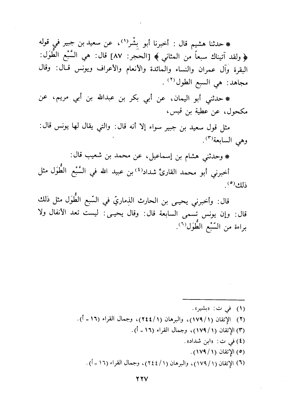 حَدَّثَنَا هُشَيْمٌ، قَالَ: أَخْبَرَنَا أَبُو بِشْرٍ، عَنْ سَعِيدِ بْنِ جُبَيْرٍ، فِي قَوْلِهِ: {وَلَقَدْ آتَيْنَاكَ سَبْعًا مِنَ الْمَثَانِي} [الحجر: 87] قَالَ: " §هِيَ السَّبْعُ الطُّوَلُ: الْبَقَرَةُ وَآلُ عِمْرَانَ وَالنِّسَاءُ وَالْمَائِدَةُ وَالْأَنْعَامُ وَالْأَعْرَافُ وَيُونُسُ ". قَالَ: وَقَالَ مُجَاهِدٌ: «هِيَ السَّبْعُ الطُّوَلُ» حَدَّثَنِي أَبُو الْيَمَانِ، عَنْ أَبِي بَكْرِ بْنِ عَبْدِ اللَّهِ بْنِ أَبِي مَرْيَمَ، عَنْ مَكْحُولٍ، عَنْ عَطِيَّةَ بْنِ قَيْسٍ، مِثْلَ قَوْلِ سَعِيدِ بْنِ جُبَيْرٍ سَوَاءً إِلَّا أَنَّهُ قَالَ: " وَالَّتِي يُقَالُ لَهَا يُونُسُ. قَالَ: «وَهِيَ السَّابِعَةُ» وَحَدَّثَنِي هِشَامُ بْنُ إِسْمَاعِيلَ، عَنْ مُحَمَّدِ بْنِ شُعَيْبٍ، قَالَ: أَخْبَرَنِي أَبُو مُحَمَّدٍ الْقَارِئُ شَدَّادُ بْنُ عُبَيْدِ اللَّهِ فِي السَّبْعِ الطُّوَلِ مِثْلَ ذَلِكَ. قَالَ: وَأَخْبَرَنِي يَحْيَى بْنُ الْحَارِثِ الذِّمَارِيُّ فِي السَّبْعِ الطُّوَلِ مِثْلَ ذَلِكَ. قَالَ: وَإِنَّ يُونُسَ تُسَمَّى السَّابِعَةَ. قَالَ: وَقَالَ يَحْيَى: لَيْسَتْ تَعُدُّ الْأَنْفَالُ وَلَا بَرَاءَةٌ مِنَ السَّبْعِ الطُّوَلِ