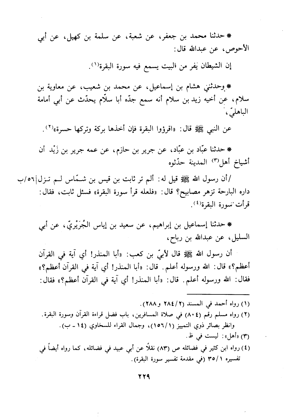 حَدَّثَنَا مُحَمَّدُ بْنُ جَعْفَرٍ، عَنْ شُعْبَةَ، عَنْ سَلَمَةَ بْنِ كُهَيْلٍ، عَنْ أَبِي الْأَحْوَصِ، عَنْ عَبْدِ اللَّهِ، قَالَ: «§إِنَّ الشَّيْطَانَ يَفِرُّ مِنَ الْبَيْتِ يَسْمَعُ فِيهِ سُورَةَ الْبَقَرَةِ»