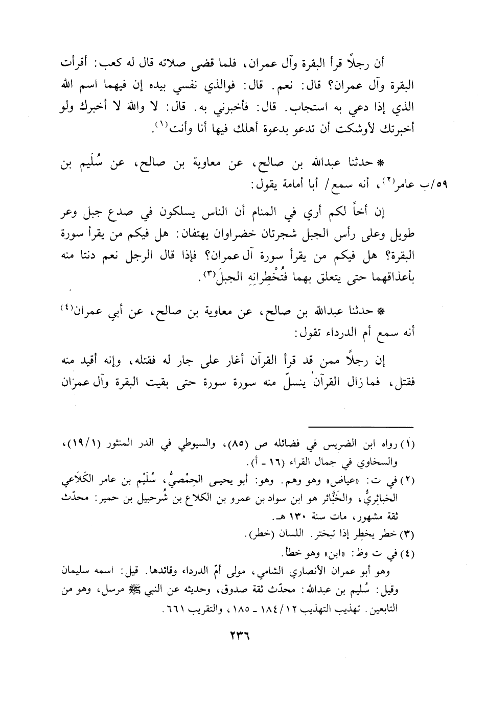 حَدَّثَنَا عَبْدُ اللَّهِ بْنُ صَالِحٍ، عَنْ مُعَاوِيَةَ بْنِ صَالِحٍ، عَنْ سُلَيْمِ بْنِ عَامِرٍ، أَنَّهُ سَمِعَ أَبَا أُمَامَةَ، يَقُولُ: " §إِنَّ أَخًا لَكُمْ أُرِيَ فِي الْمَنَامِ أَنَّ النَّاسَ يَسْلُكُونَ فِي صَدْعِ جَبَلٍ وَعْرٍ طَوِيلٍ وَعَلَى رَأْسِ الْجَبَلِ شَجَرَتَانِ خَضْرَاوَانِ يَهْتِفَانِ: هَلْ فِيكُمْ مَنْ يَقْرَأُ سُورَةَ الْبَقَرَةْ؟ هَلْ فِيكُمْ مَنْ يَقْرَأُ سُورَةَ آلِ عِمْرَانَ؟ فَإِذَا قَالَ الرَّجُلُ: نَعَمْ، دَنَتَا مِنْهُ بِأَعْذَاقِهِمَا حَتَّى يَتَعَلَّقُ بِهِمَا فَتُخْطِرَانِهِ الْجَبَلَ "
