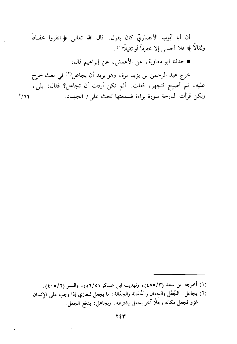 حَدَّثَنَا أَبُو مُعَاوِيَةَ، عَنِ الْأَعْمَشِ، عَنْ إِبْرَاهِيمَ، قَالَ: خَرَجَ عَبْدُ الرَّحْمَنِ بْنِ يَزِيدَ مَرَّةً، وَهُوَ يُرِيدُ أَنْ يُجَاعِلَ فِي بَعَثٍ خَرَجَ عَلَيْهِ، ثُمَّ أَصْبَحَ فَتَجَهَّزَ، فَقُلْتُ: أَلَمْ تَكُنْ أَرَدْتَ أَنْ تُجَاعِلَ؟ فَقَالَ: «بَلَى، §وَلَكِنْ قَرَأْتُ الْبَارِحَةَ سُورَةَ بَرَاءَةَ، فَسَمِعْتُهَا تَحُثُّ عَلَى الْجِهَادِ»