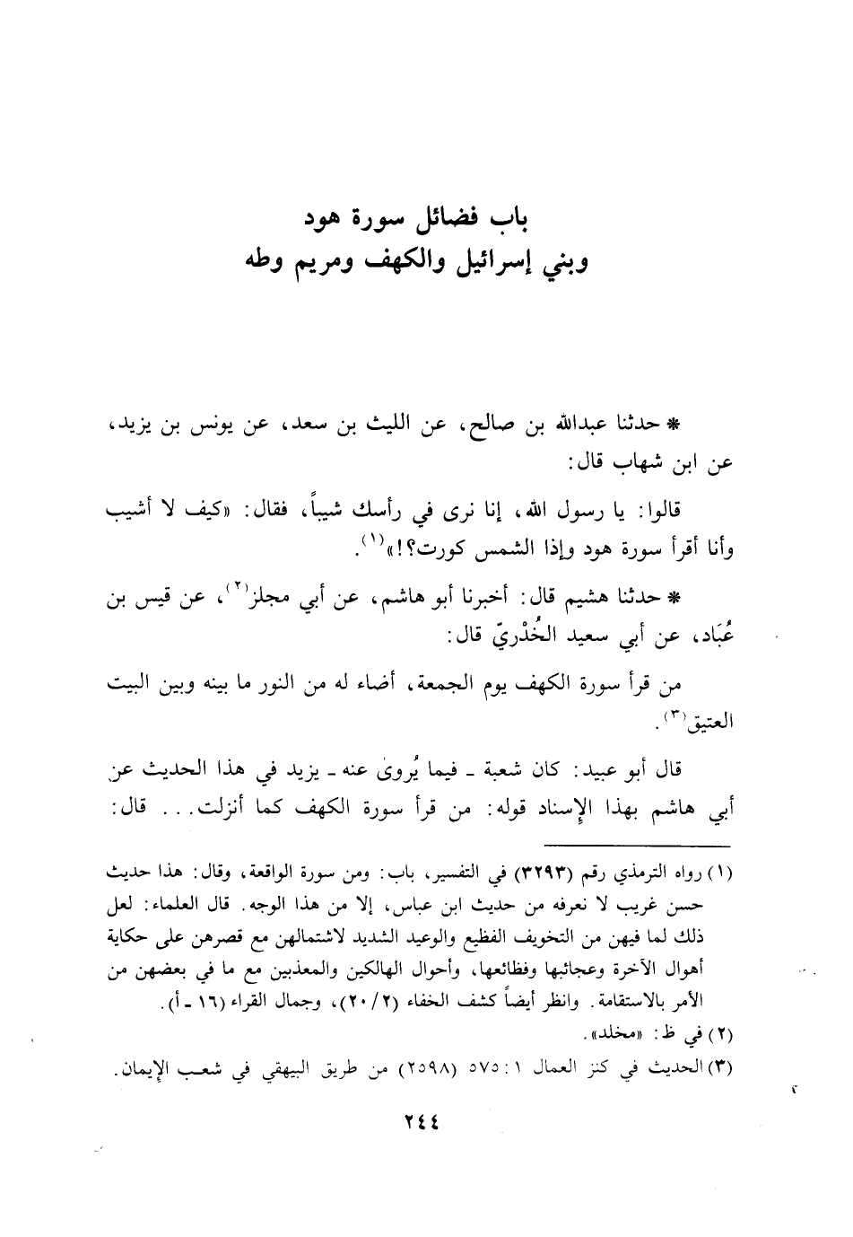 §بَابُ فَضَائِلِ سُورَةِ هُودٍ وَبَنِي إِسْرَائِيلَ وَالْكَهْفِ وَمَرْيَمَ وَطه