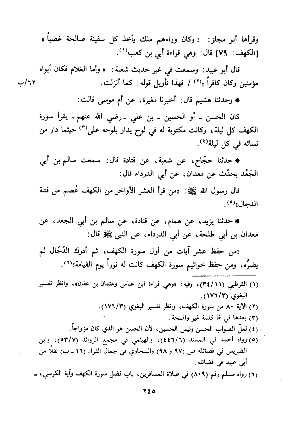 وَحَدَّثَنَا هُشَيْمٌ، قَالَ: أَخْبَرَنَا مُغِيرَةُ، عَنْ أُمِّ مُوسَى، قَالَتْ: كَانَ الْحَسَنُ أَوِ الْحُسَيْنُ بْنُ عَلِيٍّ رَضِيَ اللَّهُ عَنْهُمْ §يَقْرَأُ سُورَةَ الْكَهْفِ كُلَّ لَيْلَةٍ، وَكَانَتْ مَكْتُوبَةً لَهُ فِي لَوْحٍ يُدَارُ بِلَوْحِهِ عَلَى حَيْثُمَا دَارَ مِنْ نِسَائِهِ فِي كُلِّ لَيْلَةٍ