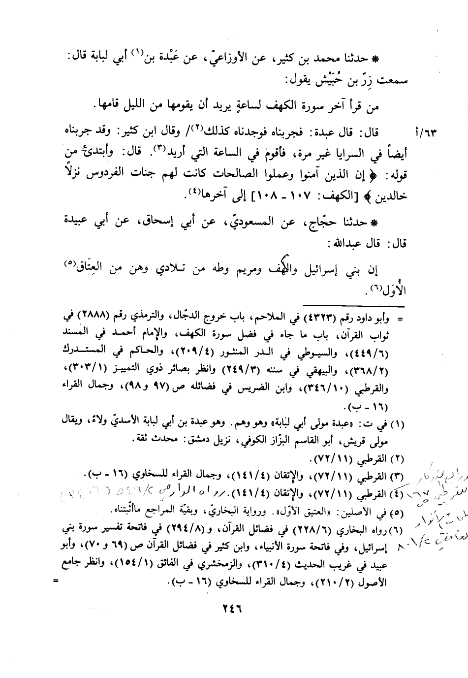 حَدَّثَنَا مُحَمَّدُ بْنُ كَثِيرٍ، عَنِ الْأَوْزَاعِيِّ، عَنْ عَبْدَةَ بْنِ أَبِي لُبَابَةَ، قَالَ: سَمِعْتُ زِرَّ بْنَ حُبَيْشٍ، يَقُولُ: «§مَنْ قَرَأَ آخِرَ سُورَةِ الْكَهْفِ لِسَاعَةٍ يُرِيدُ أَنْ يَقُومَهَا مِنَ اللَّيْلِ قَامَهَا» . قَالَ: قَالَ عَبْدَةُ: فَجَرَّبْنَاهُ، فَوَجَدْنَاهُ كَذَلِكَ. وَقَالَ ابْنُ كَثِيرٍ: وَقَدْ جَرَّبْنَاهُ أَيْضًا فِي السَّرَايَا غَيْرَ مَرَّةٍ، فَأَقُومُ فِي السَّاعَةِ الَّتِي أُرِيدُ. قَالَ: وَأَبْتَدِئُ مِنْ قَوْلِهِ: {إِنَّ الَّذِينَ آمَنُوا وَعَمِلُوا الصَّالِحَاتِ كَانَتْ لَهُمْ جَنَّاتُ الْفِرْدَوْسِ نُزُلًا خَالِدِينَ} [الكهف: 108] إِلَى آخِرِهَا
