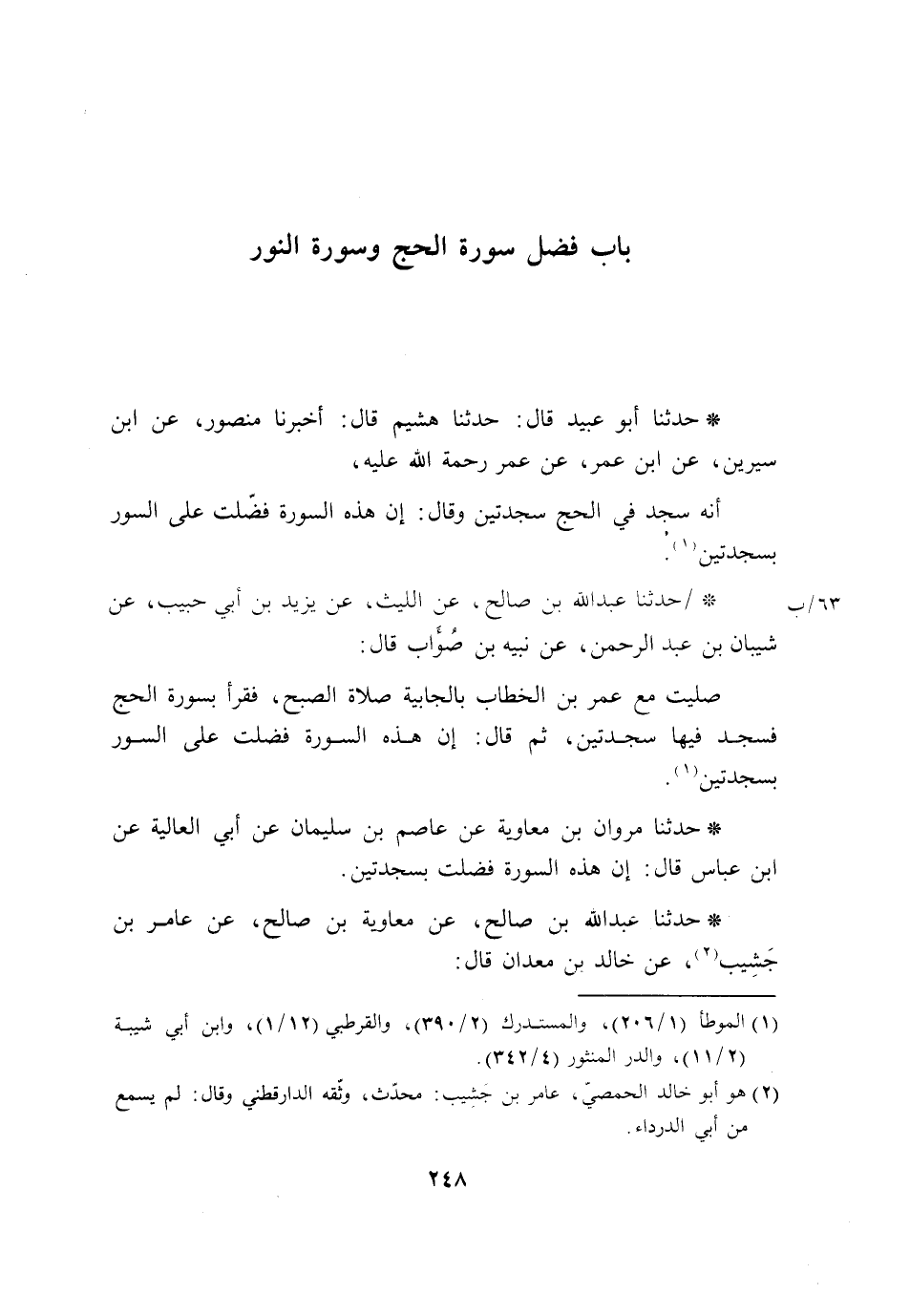 حَدَّثَنَا عَبْدُ اللَّهِ بْنِ صَالِحٍ، عَنْ مُعَاوِيَةَ بْنِ صَالِحٍ، عَنْ عَامِرِ بْنِ جَشِيبٍ، عَنْ خَالِدِ بْنِ مَعْدَانَ، قَالَ: -[249]- قَالَ رَسُولُ اللَّهِ صَلَّى اللَّهُ عَلَيْهِ وَسَلَّمَ: «§فُضِّلَتْ سُورَةُ الْحَجِّ عَلَى غَيْرِهَا بِسَجْدَتَيْنِ»
