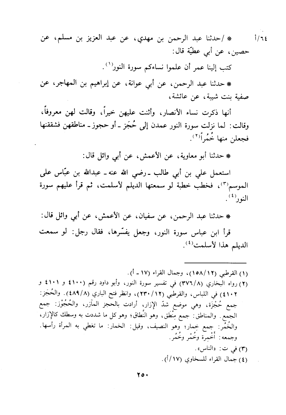 حَدَّثَنَا عَبْدُ الرَّحْمَنِ بْنُ مَهْدِيٍّ، عَنْ عَبْدِ الْعَزِيزِ بْنِ مُسْلِمٍ، عَنْ حُصَيْنٍ، عَنْ أَبِي عَطِيَّةَ، قَالَ: كَتَبَ إِلَيْنَا عُمَرُ أَنْ «§عَلِّمُوا نِسَاءَكُمْ سُورَةَ النُّورِ»
