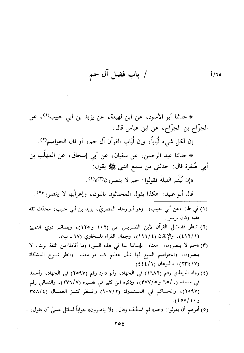 حَدَّثَنَا عَبْدُ الرَّحْمَنِ، عَنْ سُفْيَانَ، عَنْ أَبِي إِسْحَاقَ، عَنِ الْمُهَلَّبِ بْنِ أَبِي صُفْرَةَ، قَالَ: حَدَّثَنِي مَنْ سَمِعَ النَّبِيَّ صَلَّى اللَّهُ عَلَيْهِ وَسَلَّمَ يَقُولُ: " §إِنْ بُيِّتُّمُ اللَّيْلَةَ فَقُولُوا: حم لَا يُنْصَرُونَ ". قَالَ أَبُو عُبَيْدٍ: هَكَذَا يَقُولُ الْمُحْدِثُونَ بِالنُّونِ، وَإِعْرَابُهَا لَا يُنَصَرُوا