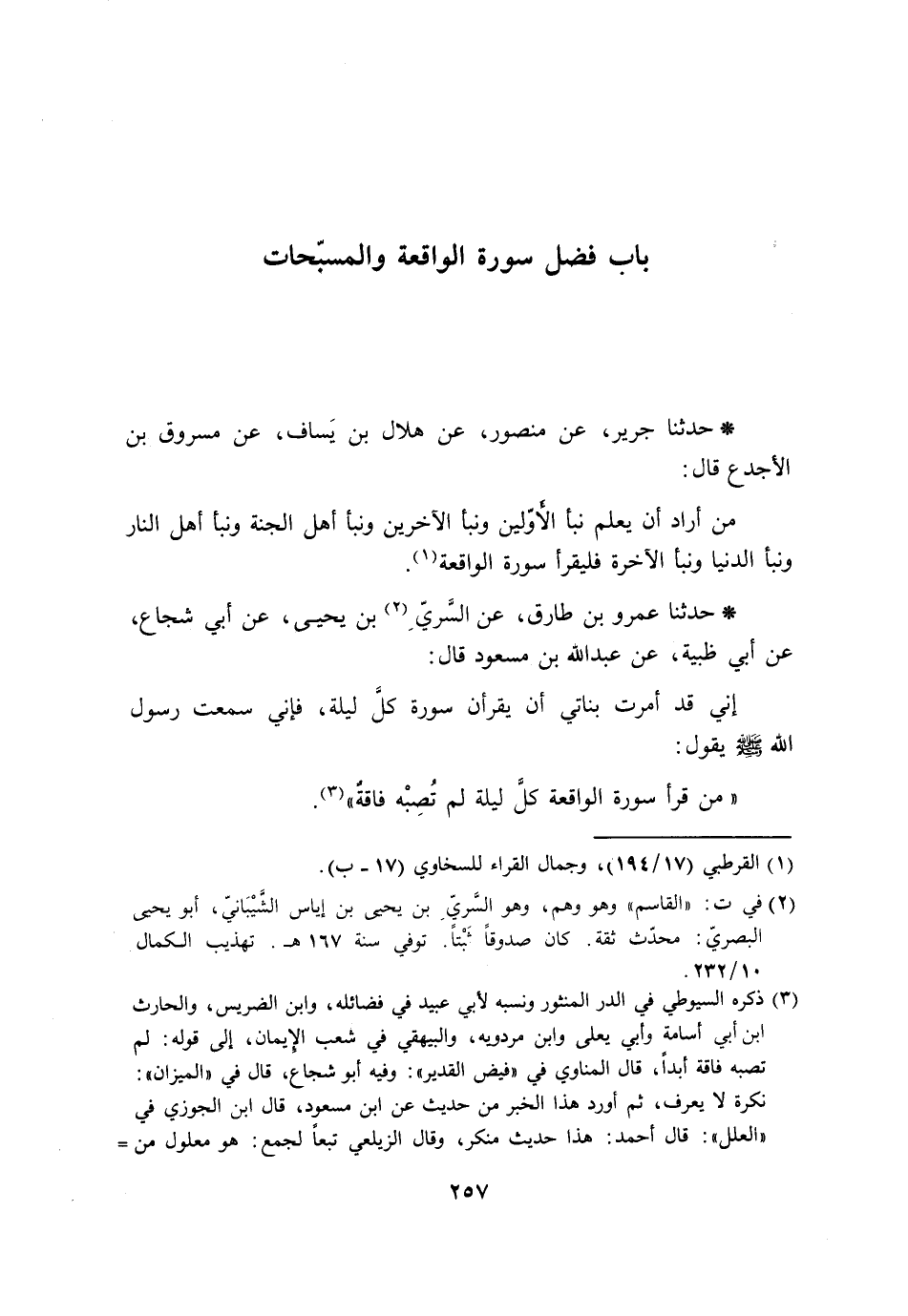 حَدَّثَنَا جَرِيرٌ، عَنْ مَنْصُورٍ، عَنْ هِلَالِ بْنِ يَسَافٍ، عَنْ مَسْرُوقِ بْنِ الْأَجْدَعِ، قَالَ: «§مَنْ أَرَادَ أَنْ يَعْلَمَ نَبَأَ الْأَوَّلِينَ، وَنَبَأَ الْآخَرِينَ، وَنَبَأَ أَهْلِ الْجَنَّةِ، وَنَبَأَ أَهْلِ النَّارِ، وَنَبَأَ الدُّنْيَا، وَنَبَأَ الْآخِرَةِ فَلْيَقْرَأْ سُورَةَ الْوَاقِعَةِ»