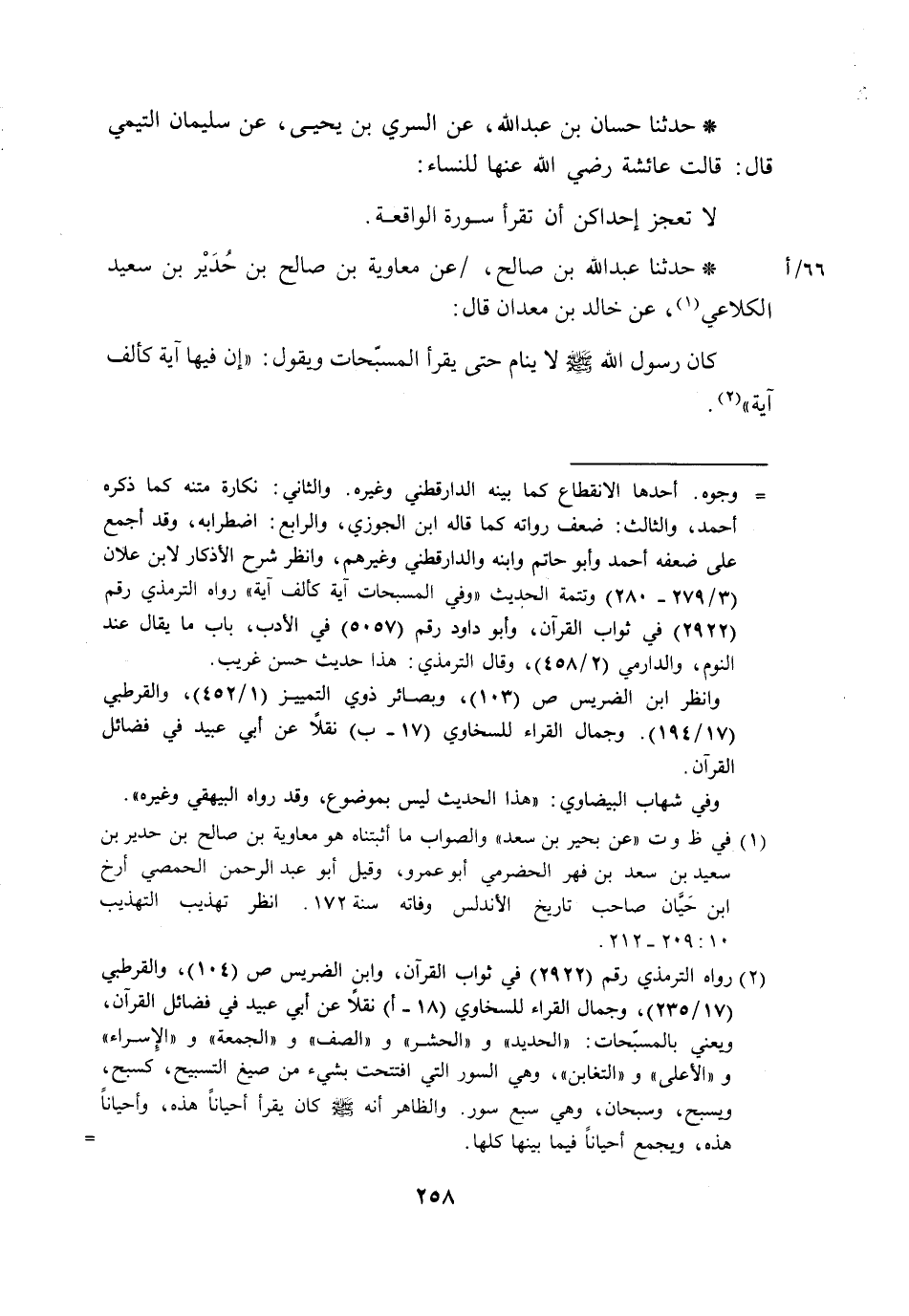 حَدَّثَنَا عَبْدُ اللَّهِ بْنُ صَالِحٍ، عَنْ مُعَاوِيَةَ بْنِ صَالِحِ بْنِ حُدَيْرِ بْنِ سَعِيدٍ الْكَلَاعِيِّ، عَنْ خَالِدِ بْنِ مَعْدَانَ، قَالَ: كَانَ رَسُولُ اللَّهِ صَلَّى اللَّهُ عَلَيْهِ وَسَلَّمَ لَا يَنَامُ حَتَّى يَقْرَأَ الْمُسَبِّحَاتِ، وَيَقُولُ: «§إِنَّ فِيهَا آيَةً كَأَلْفِ آيَةٍ»