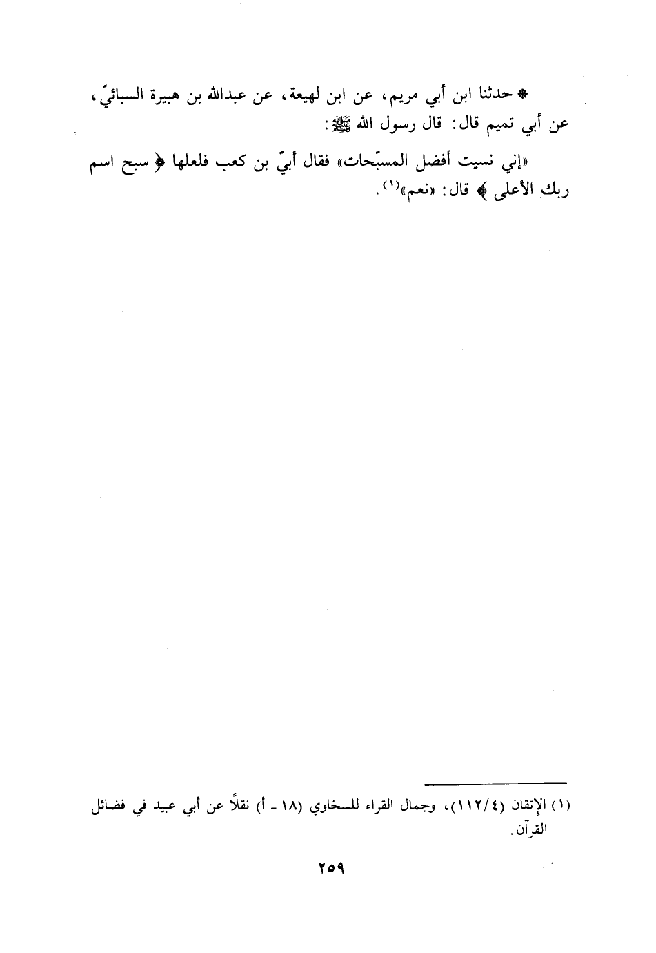 حَدَّثَنَا ابْنُ أَبِي مَرْيَمَ، عَنِ ابْنِ لَهِيعَةَ، عَنْ عَبْدِ اللَّهِ بْنِ هُبَيْرَةَ السَّبَائِيِّ، عَنْ أَبِي تَمِيمٍ، قَالَ: قَالَ رَسُولُ اللَّهِ صَلَّى اللَّهُ عَلَيْهِ وَسَلَّمَ: «§إِنِّي نَسِيتُ أَفْضَلَ الْمُسَبِّحَاتِ» فَقَالَ أُبَيُّ بْنُ كَعْبٍ فَلَعَلَّهَا {سَبِّحِ اسْمَ رَبِّكَ الْأَعْلَى} [الأعلى: 1] قَالَ: «نَعَمْ»