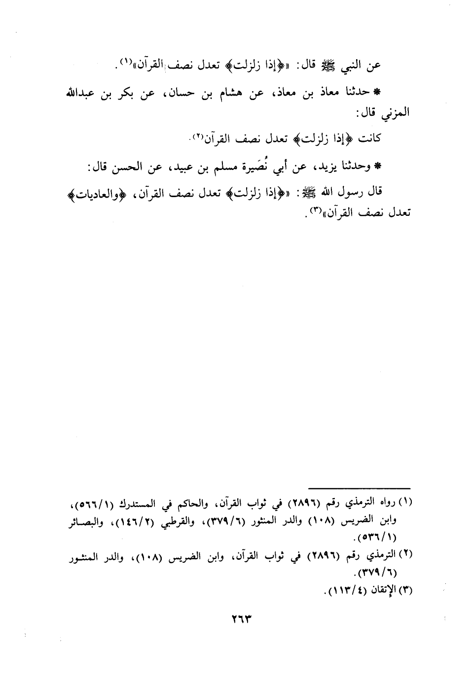حَدَّثَنَا مُعَاذُ بْنُ مُعَاذٍ، عَنْ هِشَامِ بْنِ حَسَّانَ، عَنْ بَكْرِ بْنِ عَبْدِ اللَّهِ الْمُزْنِيِّ، قَالَ: «§كَانَتْ إِذَا زُلْزِلَتْ تَعْدِلُ نِصْفَ الْقُرْآنِ»