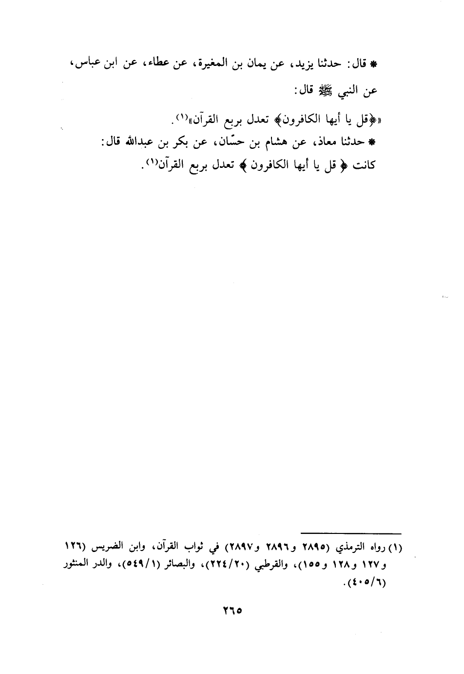 قَالَ حَدَّثَنَا يَزِيدُ، عَنْ يَمَانِ بْنِ الْمُغِيرَةِ، عَنْ عَطَاءٍ، عَنِ ابْنِ عَبَّاسٍ، عَنِ النَّبِيِّ صَلَّى اللَّهُ عَلَيْهِ وَسَلَّمَ قَالَ: «§قُلْ يَا أَيُّهَا الْكَافِرُونَ تَعْدِلُ بِرُبُعِ الْقُرْآنِ»