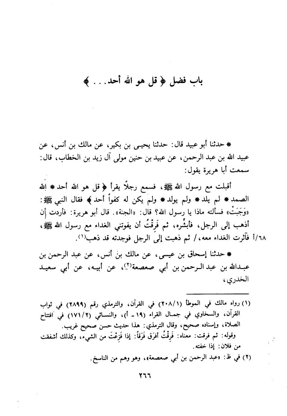 حَدَّثَنَا أَبُو عُبَيْدٍ قَالَ: حَدَّثَنَا يَحْيَى بْنُ بُكَيْرٍ، عَنْ مَالِكِ بْنِ أَنَسٍ، عَنْ عُبَيْدِ اللَّهِ بْنِ عَبْدِ الرَّحْمَنِ، عَنْ عُبَيْدِ بْنِ حُنَيْنٍ مَوْلَى آلِ زَيْدِ بْنِ الْخَطَّابِ، قَالَ: سَمِعْتُ أَبَا هُرَيْرَةَ، يَقُولُ: أَقْبَلْتُ مَعَ رَسُولِ اللَّهِ صَلَّى اللَّهُ عَلَيْهِ وَسَلَّمَ §فَسَمِعَ رَجُلًا يَقْرَأُ {قُلْ هُوَ اللَّهُ أَحَدٌ، اللَّهُ الصَّمَدُ، لَمْ يَلِدْ وَلَمْ يُولَدْ، وَلَمْ يَكُنْ لَهُ كُفُوًا أَحَدٌ} [الإخلاص: 2] فَقَالَ النَّبِيُّ صَلَّى اللَّهُ عَلَيْهِ وَسَلَّمَ: «وَجَبَتْ» . فَسَأَلْتُهُ مَاذَا يَا رَسُولَ اللَّهِ؟ قَالَ: «الْجَنَّةُ» . قَالَ أَبُو هُرَيْرَةَ: فَأَرَدْتُ أَنْ أَذْهَبَ إِلَى الرَّجُلِ، فَأُبَشِّرَهُ، ثُمَّ فَرِقْتُ أَنْ يَفُوتَنِي الْغَدَاءُ مَعَ رَسُولِ اللَّهِ صَلَّى اللَّهُ عَلَيْهِ وَسَلَّمَ، فَآثَرْتُ الْغَدَاءَ مَعَهُ ثُمَّ ذَهَبْتُ إِلَى الرَّجُلِ فَوَجَدْتُهُ قَدْ ذَهَبَ "