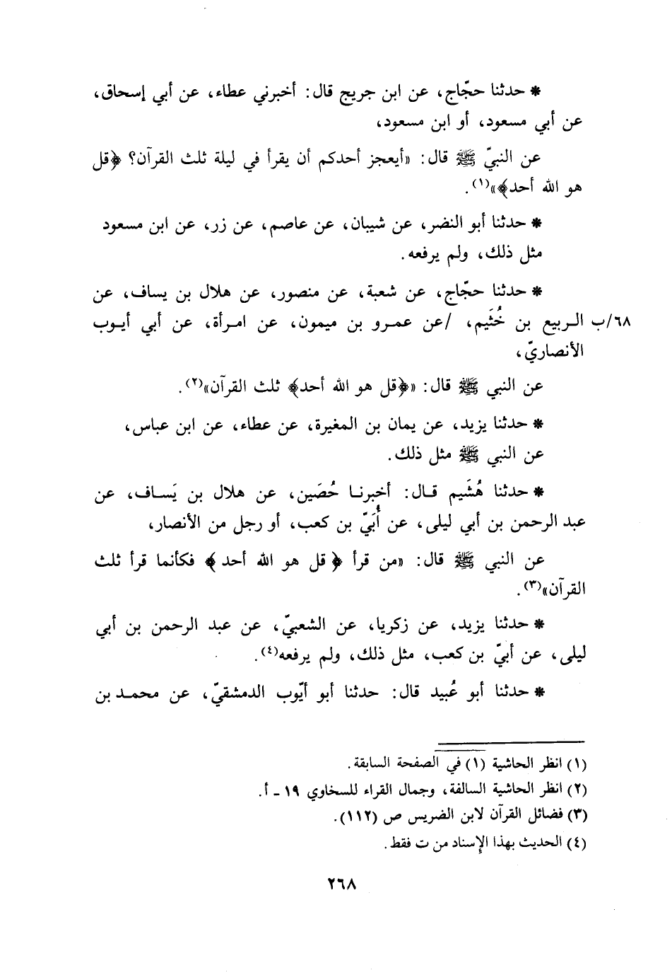 حَدَّثَنَا أَبُو عُبَيْدٍ قَالَ: حَدَّثَنَا أَبُو أَيُّوبَ الدِّمَشْقِيُّ، عَنْ مُحَمَّدِ بْنِ -[269]- نِمْرَانَ، عَنْ سَعِيدِ بْنِ بَشِيرٍ، عَنْ قَتَادَةَ، عَنْ سَالِمِ بْنِ أَبِي الْجَعْدِ، عَنْ مَعْدَانَ بْنِ أَبِي طَلْحَةَ، عَنْ أَبِي الدَّرْدَاءِ، قَالَ: جَزَّأَ رَسُولُ اللَّهِ صَلَّى اللَّهُ عَلَيْهِ وَسَلَّمَ الْقُرْآنَ ثَلَاثَةَ أَجْزَاءٍ , فَقَالَ: «§قُلْ هُوَ اللَّهُ أَحَدٌ جُزْءٌ مِنْهَا»