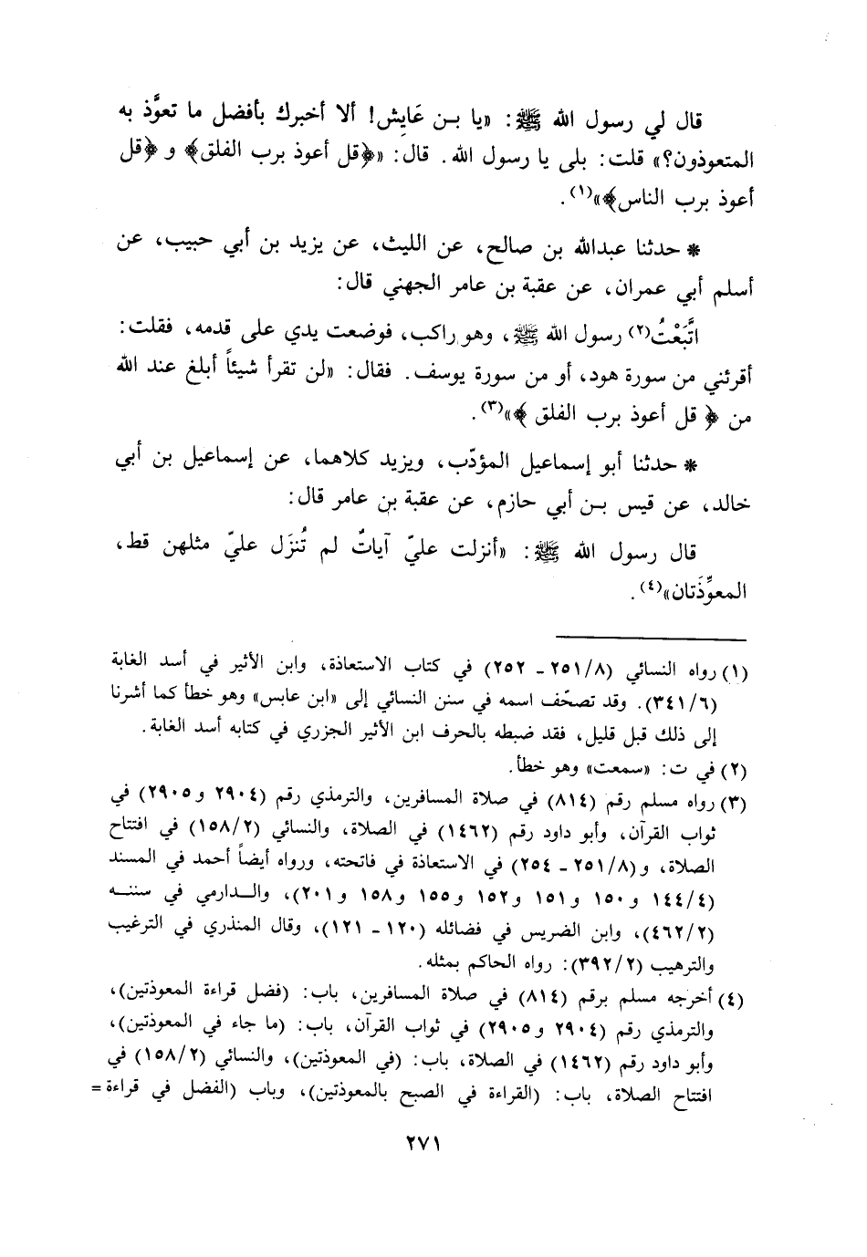 حَدَّثَنَا عَبْدُ اللَّهِ بْنِ صَالِحٍ، عَنِ اللَّيْثِ، عَنْ يَزِيدَ بْنِ أَبِي حَبِيبٍ، عَنْ أَسْلَمَ أَبِي عِمْرَانَ، عَنْ عُقْبَةَ بْنِ عَامِرٍ الْجُهَنِيِّ، قَالَ: اتَّبَعْتُ رَسُولَ اللَّهِ صَلَّى اللَّهُ عَلَيْهِ وَسَلَّمَ وَهُوَ رَاكِبٌ، فَوَضَعْتُ يَدِي عَلَى قَدَمِهِ، فَقُلْتُ: أَقْرِئْنِي مِنْ سُورَةِ هُودٍ، أَوْ مِنْ سُورَةِ يُوسُفَ. فَقَالَ: «§لَنْ تَقْرَأَ شَيْئًا أَبْلَغَ عِنْدَ اللَّهِ مِنْ قُلْ أَعُوذُ بِرَبِّ الْفَلَقِ»