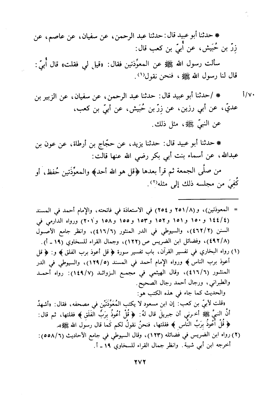 حَدَّثَنَا أَبُو عُبَيْدٍ قَالَ: حَدَّثَنَا عَبْدُ الرَّحْمَنِ، عَنْ سُفْيَانَ، عَنْ عَاصِمٍ، عَنْ زِرِّ بْنِ حُبَيْشٍ، عَنْ أُبَيِّ بْنِ كَعْبٍ، قَالَ: سَأَلْتُ رَسُولَ اللَّهِ صَلَّى اللَّهُ عَلَيْهِ وَسَلَّمَ عَنِ الْمُعَوِّذَتَيْنِ , فَقَالَ: «§قِيلَ لِي فَقُلْتُ» . قَالَ أُبَيُّ: قَالَ لَنَا رَسُولُ اللَّهِ صَلَّى اللَّهُ عَلَيْهِ وَسَلَّمَ، فَنَحْنُ نَقُولُ حَدَّثَنَا أَبُو عُبَيْدٍ قَالَ: حَدَّثَنَا عَبْدُ الرَّحْمَنِ، عَنْ سُفْيَانَ، عَنِ الزُّبَيْرِ بْنِ عَدِيٍّ، عَنْ أَبِي رَزِينٍ، عَنْ زِرِّ بْنِ حُبَيْشٍ، عَنْ أُبيِّ بْنِ كَعْبٍ، عَنِ النَّبِيِّ صَلَّى اللَّهُ عَلَيْهِ وَسَلَّمَ، مِثْلَ ذَلِكَ