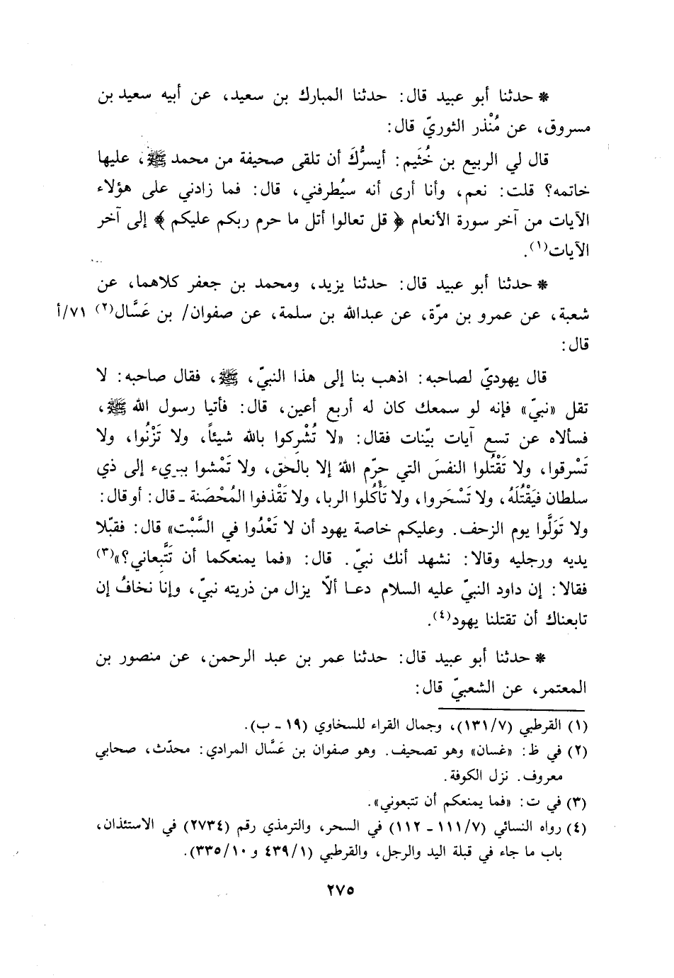 حَدَّثَنَا أَبُو عُبَيْدٍ قَالَ: حَدَّثَنَا الْمُبَارَكُ بْنُ سَعِيدٍ، عَنْ أَبِيهِ سَعِيدِ بْنِ مَسْرُوقٍ، عَنْ مُنْذِرٍ الثَّوْرِيِّ، قَالَ: قَالَ لِي الرَّبِيعُ بْنُ خُثَيْمٍ: " §أَيَسُرُّكَ أَنْ تَلْقَى صَحِيفَةً مِنْ مُحَمَّدٍ صَلَّى اللَّهُ عَلَيْهِ وَسَلَّمَ، عَلَيْهَا خَاتَمُهُ؟ قُلْتُ: نَعَمْ، وَأَنَا أَرَى أَنَّهُ سَيَطْرِفُنِي، قَالَ: فَمَا زَادَنِي عَلَى هَؤُلَاءِ الْآيَاتِ مِنْ آخِرِ سُورَةِ الْأَنْعَامِ {قُلْ تَعَالَوْا أَتْلُ مَا حَرَّمَ رَبُّكُمْ عَلَيْكُمْ} [الأنعام: 151] إِلَى آخِرِ الْآيَاتِ "