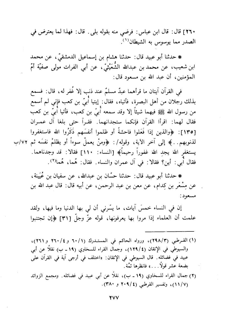 حَدَّثَنَا أَبُو عُبَيْدٍ قَالَ حَدَّثَنَا هِشَامُ بْنُ إِسْمَاعِيلَ الدِّمَشْقِيُّ، عَنْ مُحَمَّدِ بْنِ شُعَيْبٍ، عَنْ مُحَمَّدِ بْنِ عَبْدِ اللَّهِ الشُّعَيْثِيِّ، عَنْ أَبِي الْفُرَاتِ مَوْلَى صَفِيَّةَ أُمِّ الْمُؤْمِنِينَ، أَنَّ عَبْدَ اللَّهِ بْنِ مَسْعُودٍ قَالَ: «§فِي الْقُرْآنِ آيَتَانِ مَا قَرَأَهُمَا عَبْدٌ مُسْلِمٌ عِنْدَ ذَنْبٍ إِلَّا غُفِرَ لَهُ» . قَالَ: فَسَمِعَ بِذَلِكَ رَجُلَانِ مِنْ أَهْلِ الْبَصْرَةِ، فَأَتَيَاهُ، فَقَالَ: ائْتِيَا أُبَيَّ بْنَ كَعْبٍ فَإِنِّي لَمْ أَسْمَعْ مِنْ رَسُولِ اللَّهِ صَلَّى اللَّهُ عَلَيْهِ وَسَلَّمَ فِيهِمَا شَيْئًا إِلَّا وَقَدْ سَمِعَهُ أُبَيُّ بْنُ كَعْبٍ، فَأَتَيَا أُبَيَّ بْنَ كَعْبٍ فَقَالَ لَهُمَا: «اقْرَأَا الْقُرْآنَ فَإِنَّكُمَا سَتَجِدَانِهِمَا» . فَقَرَآ حَتَّى بَلَغَا آلَ عِمْرَانَ: {وَالَّذِينَ إِذَا فَعَلُوا فَاحِشَةً أَوْ ظَلَمُوا أَنْفُسَهُمْ ذَكَرُوا اللَّهَ فَاسْتَغْفَرُوا لِذُنُوبِهِمْ. . . . .} [آل عمران: 135] إِلَى آخِرِ الْآيَةِ، وَقَوْلَهُ: {وَمَنْ يَعْمَلْ سُوءًا أَوْ يَظْلِمْ نَفْسَهُ ثُمَّ يَسْتَغْفِرِ اللَّهَ يَجِدِ اللَّهَ غَفُورًا رَحِيمًا} [النساء: 110] فَقَالَا: قَدْ وَجَدْنَاهُمَا. فَقَالَ أُبَيُّ: «أَيْنَ؟» فَقَالَا: فِي آلِ عِمْرَانَ وَالنِّسَاءِ. فَقَالَ: «هُمَا، هُمَا»