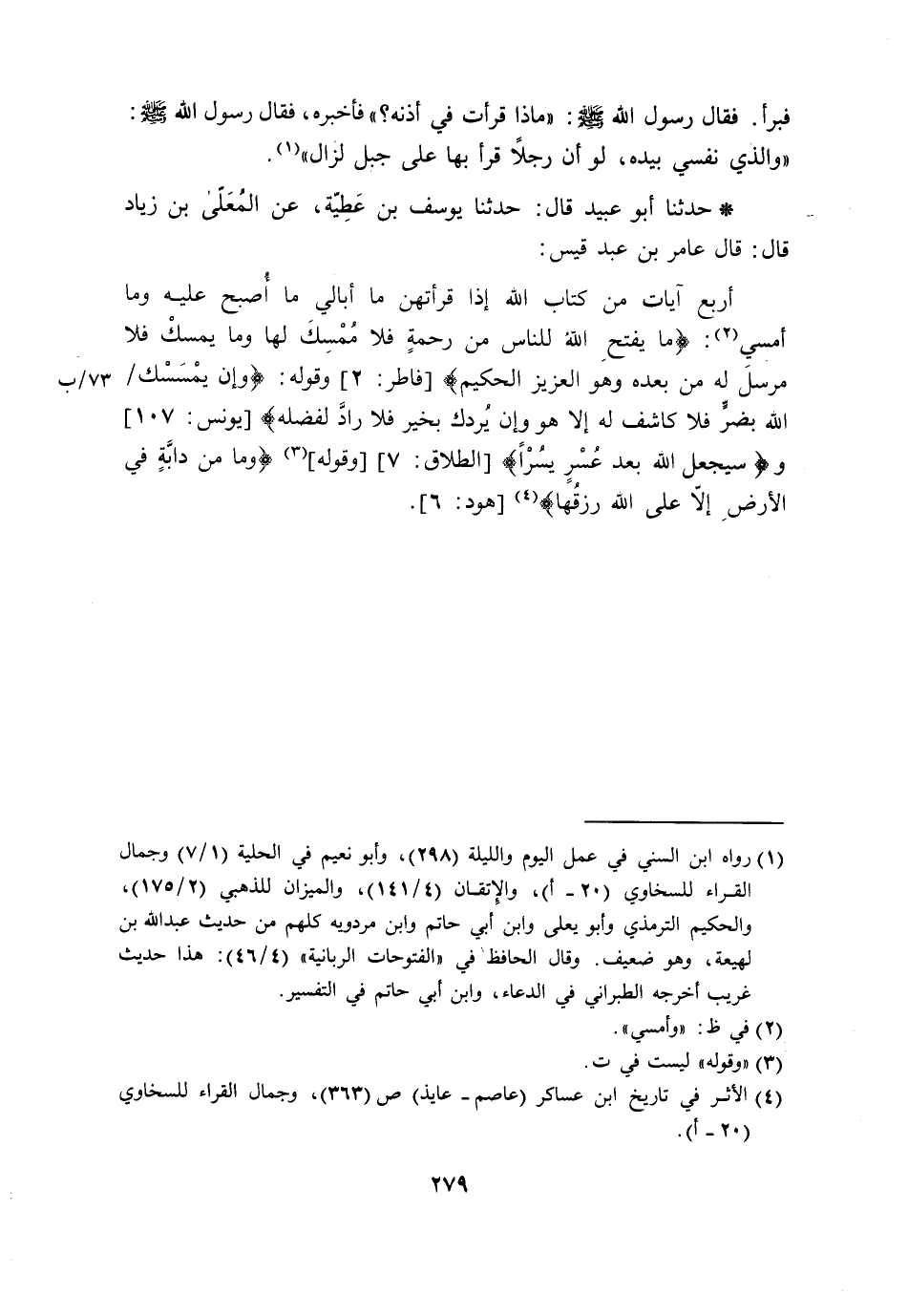 حَدَّثَنَا أَبُو عُبَيْدٍ قَالَ: حَدَّثَنَا يُوسُفُ بْنُ عَطِيَّةَ، عَنِ الْمُعَلَّى بْنِ زِيَادٍ، قَالَ: قَالَ عَامِرُ بْنُ عَبْدِ قَيْسٍ: " §أَرْبَعُ آيَاتٍ مِنْ كِتَابِ اللَّهِ إِذَا قَرَأْتُهُنَّ مَا أُبَالِي مَا أُصْبِحُ عَلَيْهِ وَمَا أُمْسِي: {مَا يُفْتَحُ اللَّهُ لِلنَّاسِ مِنْ رَحْمَةٍ فَلَا مُمْسِكَ لَهَا وَمَا يُمْسِكُ فَلَا مُرْسَلَ لَهُ مِنْ بَعْدِهِ وَهُوَ الْعَزِيزُ الْحَكِيمُ} [فاطر: 2] , وَقَوْلُهُ: {وَإِنْ يَمْسَسْكَ اللَّهُ بُضُرٍّ فَلَا كَاشِفَ لَهُ إِلَّا هُوَ وَإِنْ يُرِدْكَ بِخَيْرٍ فَلَا رَادَّ لِفَضْلِهِ} [يونس: 107] , وَ {سَيَجْعَلُ اللَّهُ بَعْدَ عُسْرٍ يُسْرًا} [الطلاق: 7] , وَقَوْلُهُ: {وَمَا مِنْ دَابَّةٍ فِي الْأَرْضِ إِلَّا عَلَى اللَّهِ رِزْقُهَا} [هود: 6] "