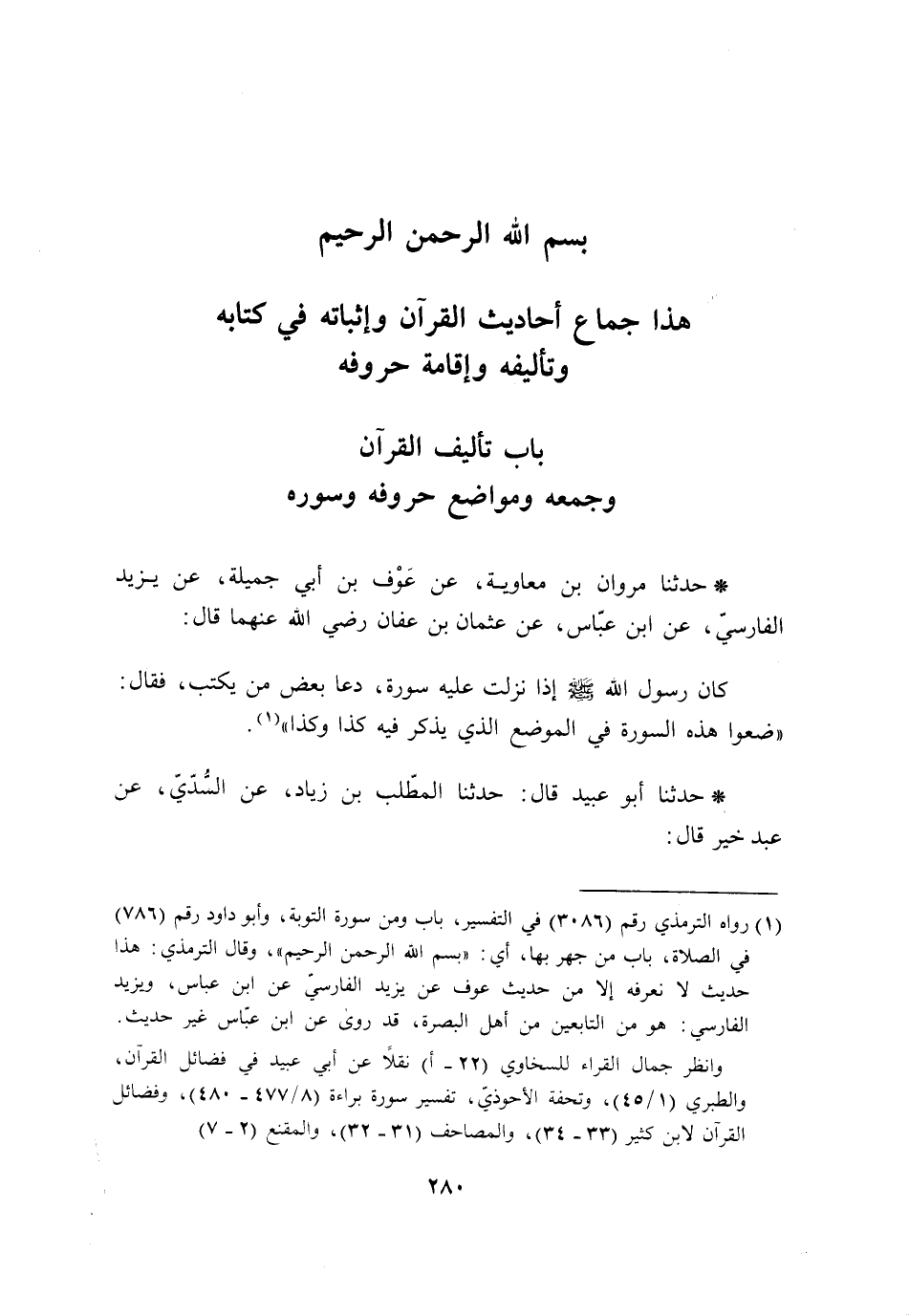§هَذَا جِمَاعُ أَحَادِيثِ الْقُرْآنِ وَإِثْبَاتِهِ فِي كِتَابِهِ وَتَأْلِيفِهِ وَإِقَامَةِ حُرُوفِهِ