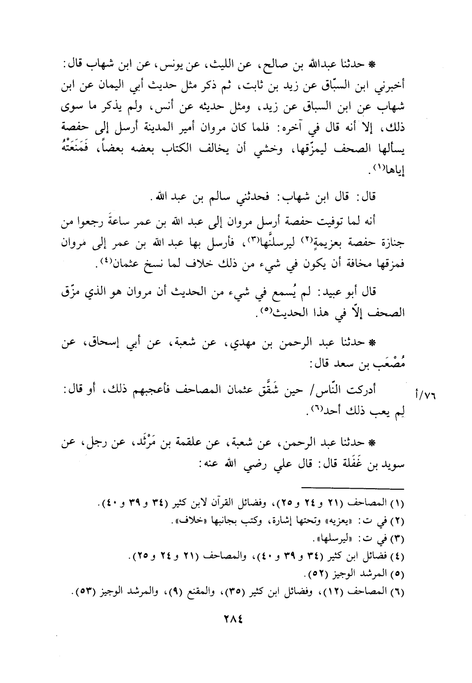 حَدَّثَنَا عَبْدُ الرَّحْمَنِ، عَنْ شُعْبَةَ، عَنْ عَلْقَمَةَ بْنِ مَرْثَدٍ، عَنْ رَجُلٍ، عَنْ سُوَيْدِ بْنِ غَفَلَةَ، قَالَ: قَالَ عَلِيٌّ رَضِيَ اللَّهُ عَنْهُ: -[285]- «§لَوْ وُلِّيتُ لَفَعَلْتُ فِي الْمَصَاحِفِ الَّذِي فَعَلَ عُثْمَانُ»