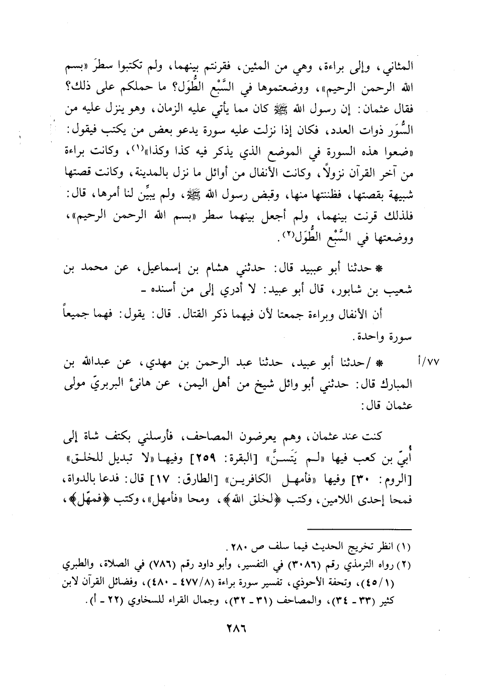 حَدَّثَنَا أَبُو عُبَيْدٍ حَدَّثَنَا عَبْدُ الرَّحْمَنِ بْنُ مَهْدِيٍّ، عَنِ عَبْدِ اللَّهِ بْنِ الْمُبَارَكِ، قَالَ: حَدَّثَنِي أَبُو وَائِلٍ شَيْخٌ مِنَ أَهْلِ الْيَمَنِ، عَنْ هَانِئٍ الْبَرْبَرِيِّ مَوْلَى عُثْمَانَ قَالَ: كُنْتُ عِنْدَ عُثْمَانَ، وَهُمْ يَعْرِضُونَ الْمَصَاحِفَ، §فَأَرْسَلَنِي بِكَتِفِ شَاةٍ إِلَى أُبَيِّ بْنِ كَعْبٍ، فِيهَا «لَمْ يَتَسَنَّ» ، وَفِيهَا «لَا تَبْدِيلَ لِلْخَلْقِ» ، وَفِيهَا «فَأَمْهَلِ الْكَافِرِينَ» . قَالَ: فَدَعَا بِالدَّوَاةِ فَمَحَا إِحْدَى اللَّامَيْنِ، وَكَتَبَ {لِخَلْقِ اللَّهِ} [الروم: 30] ، وَمَحَا «فَأَمْهِلِ» ، وَكَتَبَ {فَمَهِّلِ} [الطارق: 17]-[287]-، وَكَتَبَ {لَمْ يَتَسَنَّهْ} [البقرة: 259] أَلْحَقَ فِيهَا الْهَاءَ "