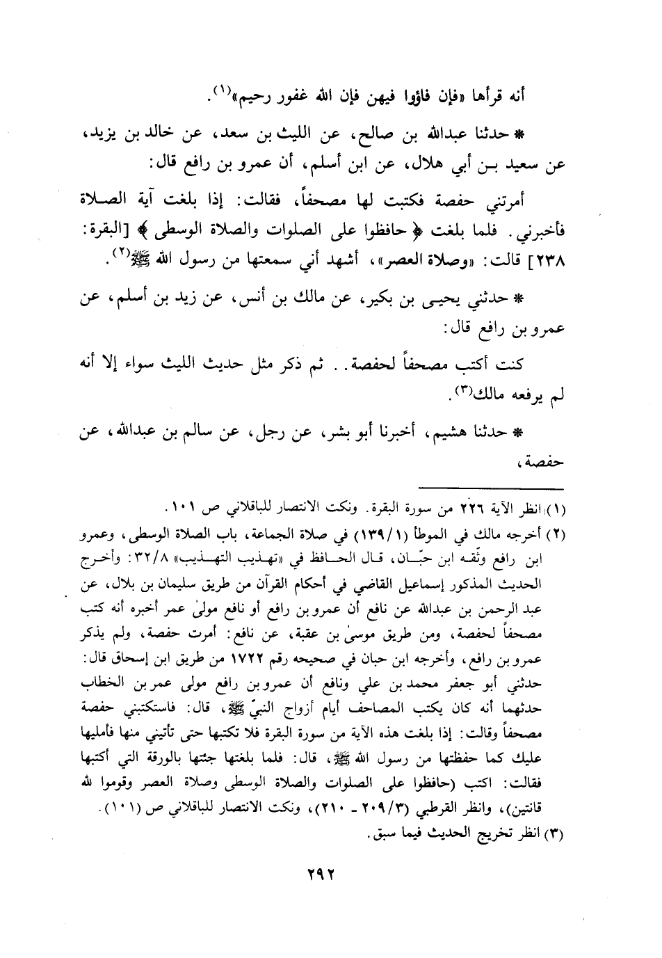 حَدَّثَنَا عَبْدُ اللَّهِ بْنُ صَالِحٍ، عَنِ اللَّيْثِ بْنِ سَعْدٍ، عَنْ خَالِدِ بْنِ يَزِيدَ، عَنْ سَعِيدِ بْنِ أَبِي هِلَالٍ، عَنِ ابْنِ أَسْلَمَ، أَنَّ عَمْرَو بْنَ رَافِعٍ، قَالَ: أَمَرْتَنِي حَفْصَةُ فَكَتَبْتُ لَهَا مُصْحَفًا، فَقَالَتْ: إِذَا بَلَغَتْ آيَةَ الصَّلَاةِ فَأَخْبِرْنِي. فَلَمَّا بَلَغْتُ {§حَافِظُوا عَلَى الصَّلَوَاتِ وَالصَّلَاةِ الْوُسْطَى} [البقرة: 238] قَالَتْ: « (وَصَلَاةِ الْعَصْرِ) ، أَشْهَدُ أَنِّي سَمِعْتُهَا مِنْ رَسُولِ اللَّهِ صَلَّى اللَّهُ عَلَيْهِ وَسَلَّمَ» حَدَّثَنِي يَحْيَى بْنُ بُكَيْرٍ، عَنْ مَالِكِ بْنِ أَنَسٍ، عَنْ زَيْدِ بْنِ أَسْلَمَ، عَنْ عَمْرِو بْنِ رَافِعٍ، قَالَ: كُنْتُ أَكْتُبُ مُصْحَفًا لِحَفْصَةَ. ثُمَّ ذَكَرَ مِثْلَ حَدِيثِ اللَّيْثِ سَوَاءً إِلَّا أَنَّهُ لَمْ يَرْفَعْهُ مَالِكٌ حَدَّثَنَا هُشَيْمٌ، أَخْبَرَنَا أَبُو بِشْرٍ، عَنْ رَجُلٍ، عَنْ سَالِمِ بْنِ عَبْدِ اللَّهِ، عَنْ حَفْصَةَ، -[293]- مِثْلَ ذَلِكَ، غَيْرَ مَرْفُوعٍ أَيْضًا، إِلَّا أَنَّهُ قَالَ: قَالَتْ: صَلَاةِ الْعَصْرِ بِغَيْرِ وَاو حَدَّثَنَا مَرْوَانُ بْنُ شُجَاعٍ، عَنْ خُصَيْفٍ، عَنْ زِيَادِ بْنِ أَبِي مَرْيَمَ، عَنْ عَائِشَةَ، أَنَّهَا أَمَرَتِ الَّذِي يَكْتُبُ مُصْحَفَهَا بِمِثْلِ مَا أَمَرَتْ بِهِ حَفْصَةُ، غَيْرِ مَرْفُوعٍ أَيْضًا، وَلَيْسَ فِيهَا وَاوٌ