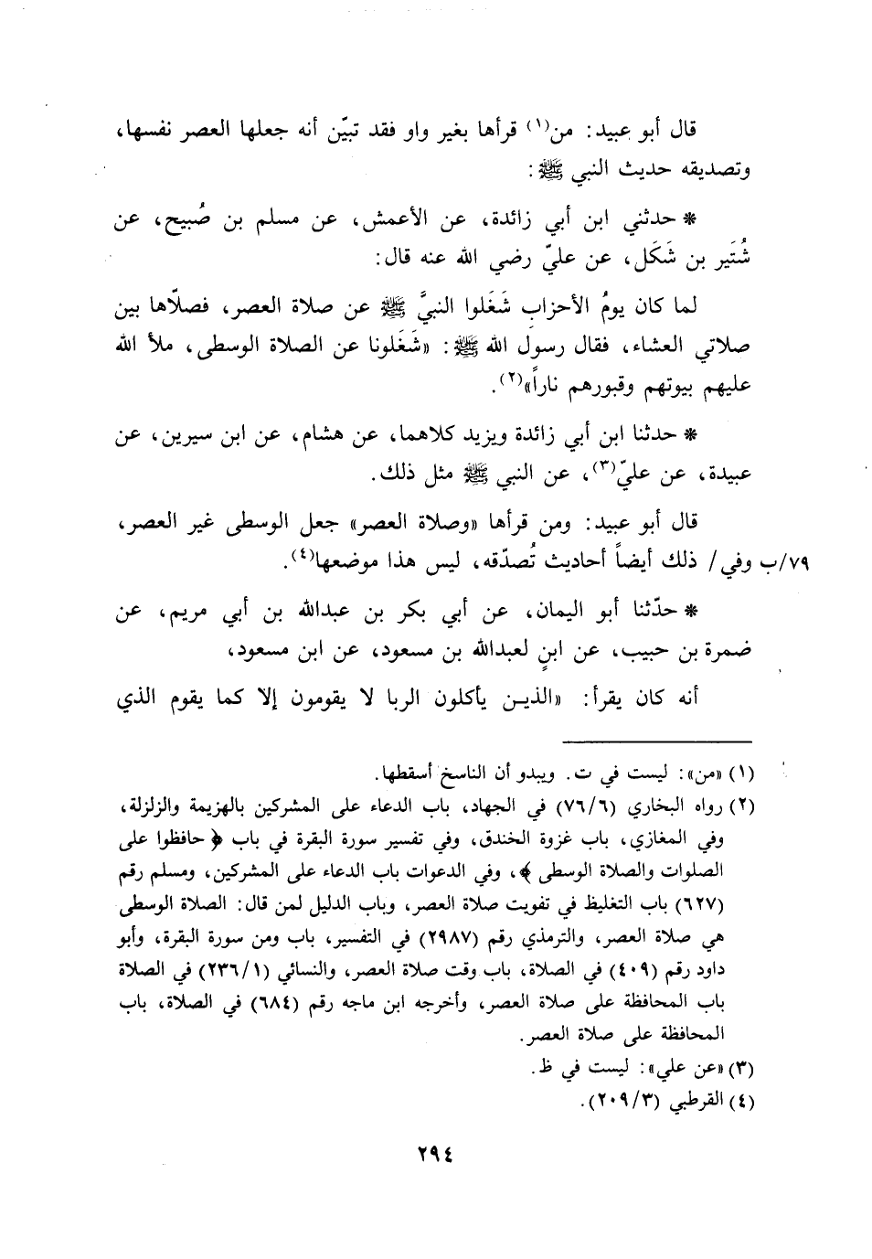 حَدَّثَنِي ابْنُ أَبِي زَائِدَةَ، عَنِ الْأَعْمَشِ، عَنْ مُسْلِمِ بْنِ صُبَيْحٍ، عَنْ شُتَيْرِ بْنِ شَكَلٍ، عَنْ عَلِيٍّ، رَضِيَ اللَّهُ عَنْهُ قَالَ: لَمَّا كَانَ يَوْمُ الْأَحْزَابِ شَغَلُوا النَّبِيَّ صَلَّى اللَّهُ عَلَيْهِ وَسَلَّمَ عَنْ صَلَاةِ الْعَصْرِ، فَصَلَّاهَا بَيْنَ صَلَاتِي الْعِشَاءِ، فَقَالَ رَسُولُ اللَّهِ صَلَّى اللَّهُ عَلَيْهِ وَسَلَّمَ: «§شَغَلُونَا عَنِ الصَّلَاةِ الْوُسْطَى، مَلَأَ اللَّهُ عَلَيْهِمْ بُيُوتَهُمْ وَقُبُورَهُمْ نَارًا» حَدَّثَنَا ابْنُ أَبِي زَائِدَةَ وَيَزِيدُ، كِلَاهُمَا، عَنْ هِشَامٍ، عَنِ ابْنِ سِيرِينَ، عَنْ عَبِيدَةَ، عَنْ عَلِيٍّ، عَنِ النَّبِيِّ صَلَّى اللَّهُ عَلَيْهِ وَسَلَّمَ مِثْلَ ذَلِكَ. قَالَ أَبُو عُبَيْدٍ: وَمَنْ قَرَأَهَا: وَصَلَاةِ الْعَصْرِ. جَعَلَ الْوُسْطَى غَيْرَ الْعَصْرِ، وَفِي ذَلِكَ أَيْضًا أَحَادِيثُ تُصَدِّقْهُ، لَيْسَ هَذَا مَوْضِعَهَا