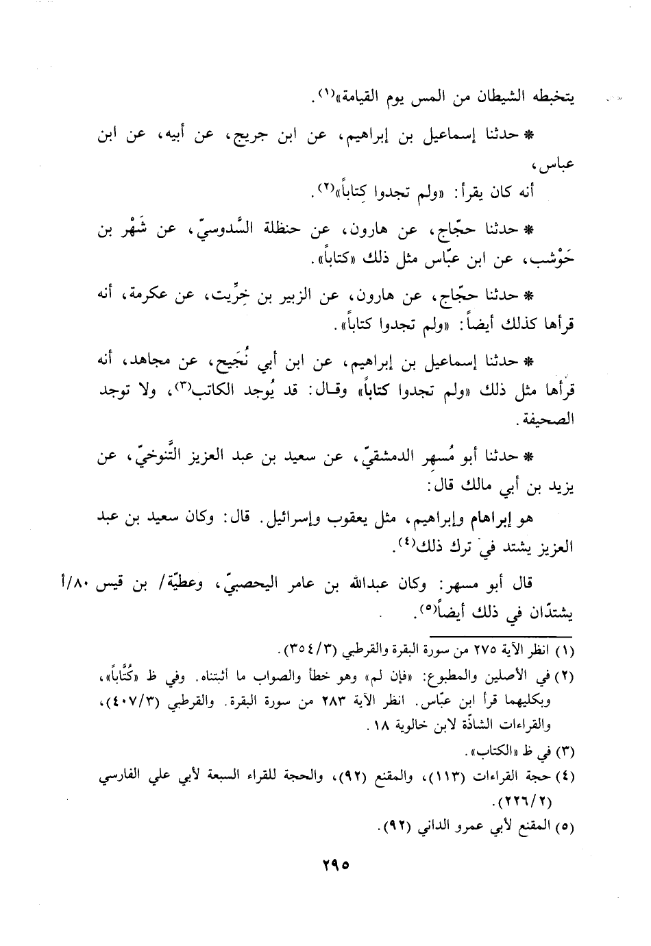 حَدَّثَنَا إِسْمَاعِيلُ بْنُ إِبْرَاهِيمَ، عَنِ ابْنِ جُرَيْجٍ، عَنْ أَبِيهِ، عَنِ ابْنِ عَبَّاسٍ، أَنَّهُ §كَانَ يَقْرَأُ: «وَلَمْ تَجِدُوا كِتَابًا» حَدَّثَنَا حَجَّاجٌ، عَنْ هَارُونَ، عَنْ حَنْظَلَةَ السَّدُوسِيِّ، عَنْ شَهْرِ بْنِ حَوْشَبٍ، عَنِ ابْنِ عَبَّاسٍ، مِثْلَ ذَلِكَ: «كِتَابًا» حَدَّثَنَا حَجَّاجٌ، عَنْ هَارُونَ، عَنِ الزُّبَيْرِ بْنِ خِرِّيتٍ، عَنْ عِكْرِمَةَ، أَنَّهُ قَرَأَهَا كَذَلِكَ أَيْضًا: «وَلَمْ تَجِدُوا كِتَابًا» حَدَّثَنَا إِسْمَاعِيلُ بْنُ إِبْرَاهِيمَ، عَنِ ابْنِ أَبِي نَجِيحٍ، عَنْ مُجَاهِدٍ، أَنَّهُ قَرَأَهَا مِثْلَ ذَلِكَ: وَلَمْ تَجِدُوا كِتَابًا. وَقَالَ: قَدْ يُوجَدُ الْكَاتِبُ، وَلَا تُوجَدُ الصَّحِيفَةُ