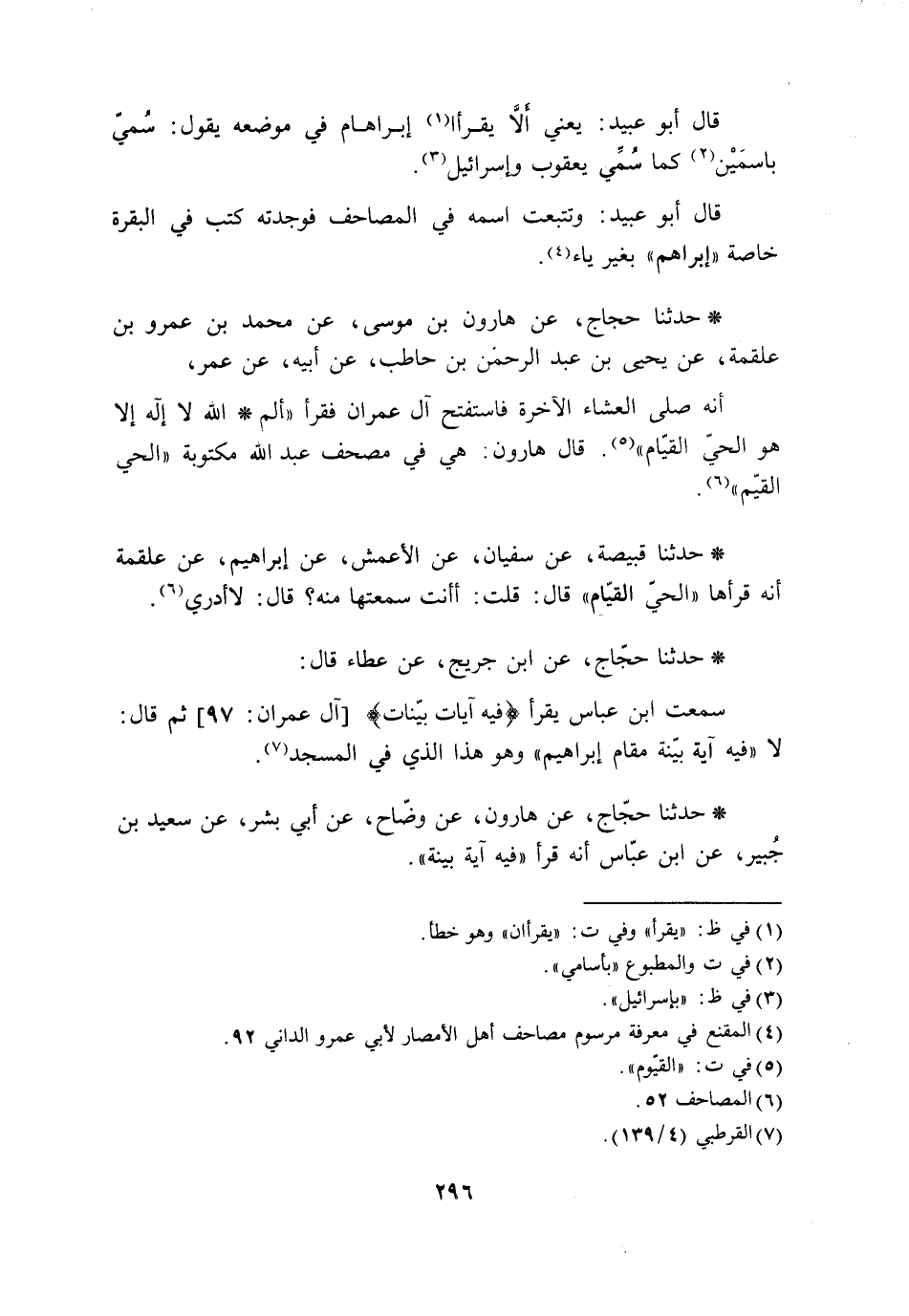 حَدَّثَنَا حَجَّاجٌ، عَنْ هَارُونَ بْنِ مُوسَى، عَنْ مُحَمَّدِ بْنِ عَمْرِو بْنِ عَلْقَمَةَ، عَنْ يَحْيَى بْنِ عَبْدِ الرَّحْمَنِ بْنِ حَاطِبٍ، عَنْ أَبِيهِ، عَنْ عُمَرَ، أَنَّهُ §صَلَّى الْعِشَاءَ الْآخِرَةَ فَاسْتَفْتَحَ آلَ عِمْرَانَ فَقَرَأَ: «الم اللَّهُ لَا إِلَهَ إِلَّا هُوَ الْحَيُّ الْقَيَّامُ» . قَالَ هَارُونُ: هِيَ فِي مُصْحَفِ عَبْدِ اللَّهِ مَكْتُوبَةٌ: «الْحَيُّ الْقَيِّمُ»