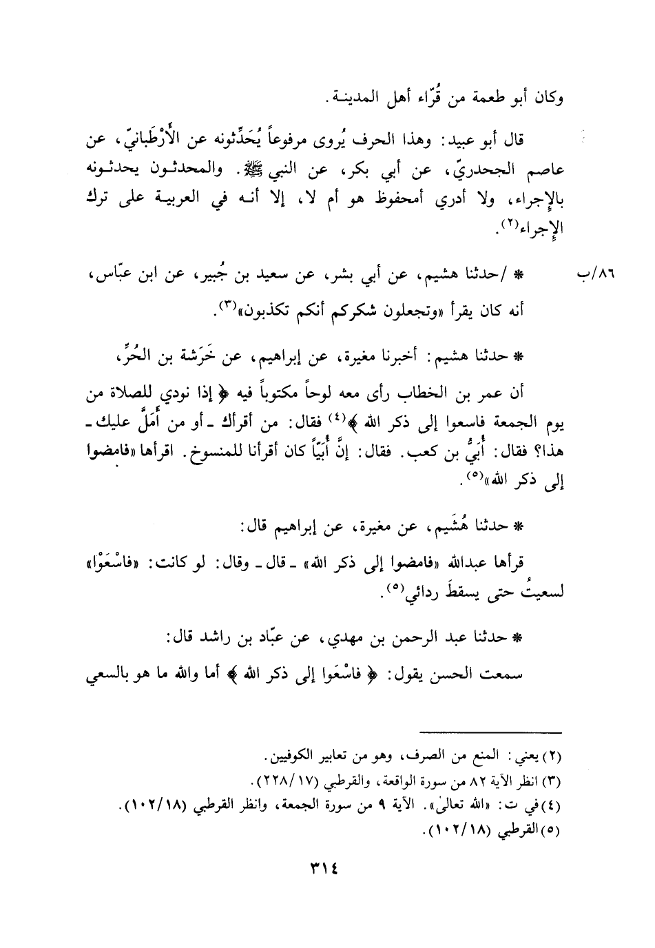 حَدَّثَنَا هُشَيْمٌ، عَنْ مُغِيرَةَ، عَنْ إِبْرَاهِيمَ، قَالَ: قَرَأَهَا عَبْدُ اللَّهِ (فَامْضُوا إِلَى ذِكْرِ اللَّهِ) قَالَ: وَقَالَ: " §لَوْ كَانَتْ: (فَاسْعَوْا) لَسَعَيْتُ حَتَّى يَسْقُطَ رِدَائِي "