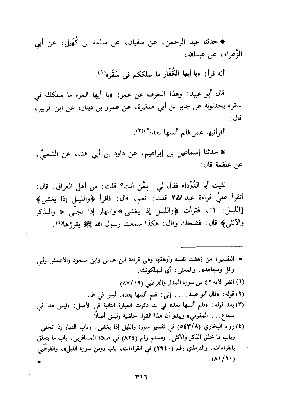 حَدَّثَنَا عَبْدُ الرَّحْمَنِ، عَنْ سُفْيَانَ، عَنْ سَلَمَةَ بْنِ كُهَيْلٍ، عَنْ أَبِي الزَّعْرَاءِ، عَنْ عَبْدِ اللَّهِ، أَنَّهُ §قَرَأَ: (يَا أَيُّهَا الْكُفَّارُ مَا سَلَكَكُمْ فِي سَقَرَ) . قَالَ أَبُو عُبَيْدٍ: وَهَذَا الْحَرْفُ عَنْ عُمَرَ: (يَا أَيُّهَا الْمَرْءُ مَا سَلَكَكَ فِي سَقَرَ) يُحَدِّثُونَهُ عَنْ جَابِرِ بْنِ أَبِي صَغِيرَةَ، عَنْ عَمْرِو بْنِ دِينَارٍ، عَنِ ابْنِ الزُّبَيْرِ، قَالَ: أَقْرَأَنِيهَا عُمَرُ فَلَمْ أَنْسَهَا بَعْدُ