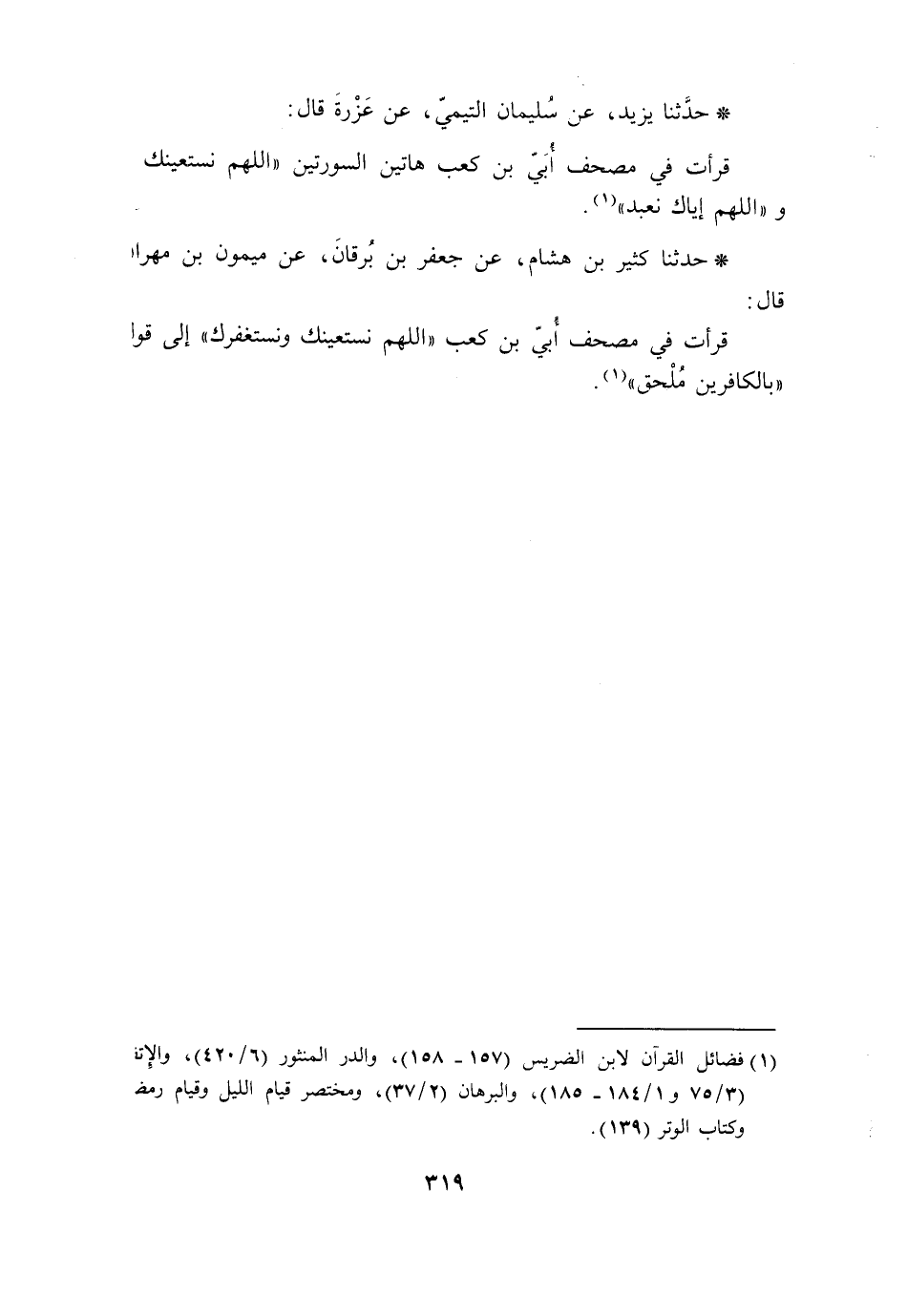 حَدَّثَنَا كَثِيرُ بْنُ هِشَامٍ، عَنْ جَعْفَرِ بْنِ بُرْقَانَ، عَنْ مَيْمُونِ بْنِ مِهْرَانَ، قَالَ: §قَرَأْتُ فِي مُصْحَفِ أُبَيِّ بْنِ كَعْبٍ (اللَّهُمَّ نَسْتَعِينُكَ وَنَسْتَغْفِرُكَ) إِلَى قَوْلِهِ (بِالْكَافِرِينَ مُلْحَقٌ)