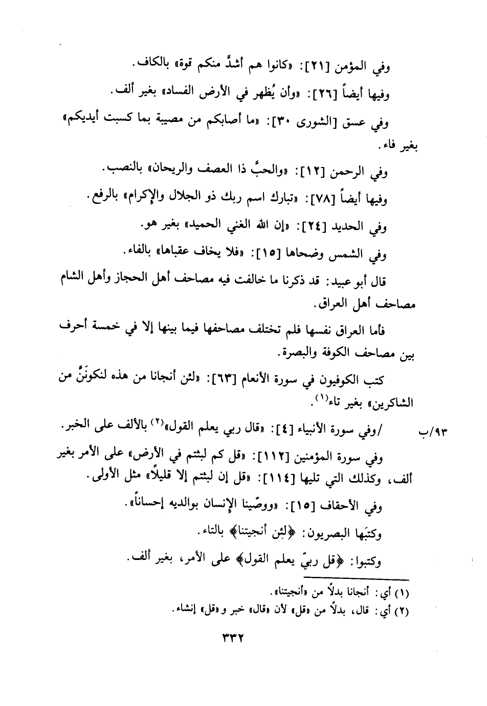 وَفِي الْمُؤْمِنِ: (كَانُوا هُمْ أَشَدُّ مِنْكُمْ قُوَّةً) بِالْكَافِ. وَفِيهَا أَيْضًا: (وَأَنْ يُظْهَرَ فِي الْأَرْضِ الْفَسَادَ) بِغَيْرِ أَلِفٍ. وَفِي عسق: (مَا أَصَابَكُمْ مِنْ مُصِيبَةٍ بِمَا كَسَبَتْ أَيْدِيكُمْ) بِغَيْرِ فَاءٍ. وَفِي الرَّحْمَنِ: (وَالْحَبَّ ذَا الْعَصْفَ وَالرَّيْحَانَ) بِالنَّصْبِ. وَفِيهَا أَيْضًا: (تَبَارَكَ اسْمُ رَبِّكَ ذُو الْجَلَالِ وَالْإِكْرَامِ) بِالرَّفْعِ. وَفِي الْحَدِيدِ: (إِنَّ اللَّهَ الْغَنِيُّ الْحَمِيدُ) بِغَيْرِ هُوَ. وَفِي الشَّمْسِ وَضُحَاهَا (فَلَا يَخَافُ عُقْبَاهَا) بِالْفَاءِ. قَالَ أَبُو عُبَيْدٍ: قَدْ ذَكَرْنَا مَا خَالَفَتْ فِيهِ مَصَاحِفُ أَهْلِ الْحِجَازِ وَأَهْلِ الشَّامِ مَصَاحِفَ أَهْلِ الْعِرَاقِ، فَأَمَّا الْعِرَاقُ نَفْسُهَا فَلَمْ تَخْتَلِفْ مَصَاحِفُهَا فِيمَا بَيْنَهَا إِلَّا خَمْسَةَ أَحْرُفٍ بَيْنَ مَصَاحِفِ الْكُوفَةِ وَالْبَصْرَةِ. كَتَبَ الْكُوفِيُّونَ فِي سُورَةِ الْأَنْعَامِ: {لَئِنْ أَنْجَانَا مِنْ هَذِهِ لَنَكُونَنَّ مِنَ الشَّاكِرِينَ} [الأنعام: 63] بِغَيْرِ تَاءٍ. وَفِي سُورَةِ الْأَنْبِيَاءِ: {قَالَ رَبِّي يَعْلَمُ الْقَوْلَ} [الأنبياء: 4] بِالْأَلْفِ عَلَى الْخَبَرِ. وَفِي سُورَةِ الْمُؤْمِنِينَ: (قُلْ كَمْ لَبِثْتُمْ فِي الْأَرْضِ) عَلَى الْأَمْرِ بِغَيْرِ أَلِفٍ، وَكَذَلِكَ الَّتِي تَلِيهَا: (قُلْ إِنْ لَبِثْتُمْ إِلَّا قَلِيلًا) مِثْلُ الْأُولَى. وَفِي الْأَحْقَافِ: {وَوَصَّيْنَا الْإِنْسَانُ بِوَالِدَيْهِ إِحْسَانًا} [الأحقاف: 15] . وَكَتَبَهَا الْبَصْرِيُّونَ: لَئِنْ أَنْجَيْتَنَا بِالتَّاءِ. وَكَتَبُوا: (قُلْ رَبِّي يَعْلَمُ الْقَوْلَ) عَلَى الْأَمْرِ، بِغَيْرِ أَلِفٍ.