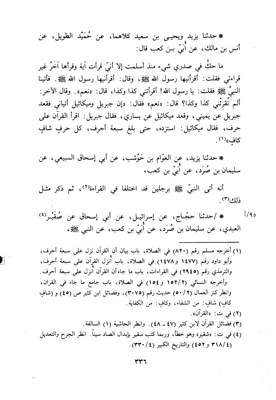 حَدَّثَنَا يَزِيدُ، وَيَحْيَى بْنُ سَعِيدٍ، كِلَاهُمَا، عَنْ حُمَيْدٍ الطَّوِيلِ، عَنْ أَنَسِ بْنِ مَالِكٍ، عَنْ أُبَيِّ بْنِ كَعْبٍ، قَالَ: مَا حَكَّ فِي صَدْرِي شَيْءٌ مُنْذُ أَسْلَمْتُ إِلَّا أَنِّي قَرَأْتُ آيَةً وَقَرَأَهَا آخِرُ غَيْرَ قِرَاءَتِي فَقُلْتُ: أَقْرَأَنِيهَا رَسُولُ اللَّهَ صَلَّى اللَّهُ عَلَيْهِ وَسَلَّمَ، وَقَالَ: أَقْرَأَنِيهَا رَسُولُ اللَّهَ صَلَّى اللَّهُ عَلَيْهِ وَسَلَّمَ. فَأَتَيْنَا النَّبِيَّ صَلَّى اللَّهُ عَلَيْهِ وَسَلَّمَ فَقُلْتُ: يَا رَسُولَ اللَّهِ، أَقْرَأْتَنِي كَذَا وَكَذَا، قَالَ: «نَعَمْ» . وَقَالَ الْآخَرُ: أَلَمْ تُقْرِئْنِي كَذَا وَكَذَا؟ قَالَ: «نَعَمْ» . فَقَالَ: " §إِنَّ جِبْرِيلَ وَمِيكَائِيلَ أَتَيَانِي فَقَعَدَ جِبْرِيلُ عَنْ يَمِينِي، وَقَعَدَ مِيكَائِيلُ عَنْ يَسَارِي، فَقَالَ جِبْرِيلُ: اقْرَأِ الْقُرْآنَ عَلَى حَرْفٍ، فَقَالَ مِيكَائِيلُ: اسْتَزِدْهُ، حَتَّى بَلَغَ سَبْعَةَ أَحْرُفٍ، كُلُّ حَرْفٍ شَافٍ كَافٍ " حَدَّثَنَا يَزِيدُ، عَنِ الْعَوَّامِ بْنِ حَوْشَبٍ، عَنْ أَبِي إِسْحَاقَ السَّبِيعِيِّ، عَنْ سُلَيْمَانَ بْنِ صُرَدٍ، عَنِ أُبَيِّ بْنِ كَعْبٍ، أَنَّهُ أَتَى النَّبِيَّ صَلَّى اللَّهُ عَلَيْهِ وَسَلَّمَ بِرَجُلَيْنِ قَدِ اخْتَلَفَا فِي الْقِرَاءَةِ، ثُمَّ ذَكَرَ مِثْلَ ذَلِكَ حَدَّثَنَا حَجَّاجٌ، عَنْ إِسْرَائِيلَ، عَنْ أَبِي إِسْحَاقَ، عَنْ شُقَيْرٍ الْعَبْدِيِّ، عَنْ سُلَيْمَانَ بْنِ صُرَدٍ، عَنْ أُبَيِّ بْنِ كَعْبٍ، عَنِ النَّبِيِّ صَلَّى اللَّهُ عَلَيْهِ وَسَلَّمَ، مِثْلَ ذَلِكَ أَوْ نَحْوَهُ حَدَّثَنَا حَجَّاجٌ، عَنْ شُعْبَةَ، عَنِ الْحَكَمِ، عَنْ عَبْدِ الرَّحْمَنِ بْنِ أَبِي لَيْلَى، عَنْ أُبَيِّ بْنِ كَعْبٍ، عَنِ النَّبِيِّ صَلَّى اللَّهُ عَلَيْهِ وَسَلَّمَ، -[337]- مِثْلَ ذَلِكَ أَيْضًا