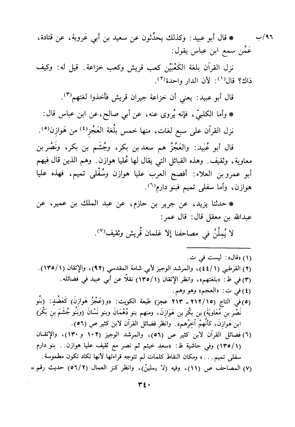 وَأَمَّا الْكَلْبِيُّ، فَإِنَّهُ يُرْوَى عَنْهُ، عَنْ أَبِي صَالِحٍ، عَنِ ابْنِ عَبَّاسٍ، قَالَ: §نَزَلَ الْقُرْآنُ عَلَى سَبْعِ لُغَاتٍ، مِنْهَا خَمْسٌ بِلُغَةِ الْعَجُزِ مِنْ هَوَازِنَ. قَالَ أَبُو عُبَيْدٍ: وَالْعَجُزُ هُمْ سَعْدُ بْنُ بَكْرٍ، وَجُشَمُ بْنُ بَكْرٍ، وَنَصْرُ بْنُ مُعَاوِيَةَ، وَثَقِيفُ. وَهَذِهِ الْقَبَائِلُ الَّتِي يُقَالُ لَهَا عُلْيَا هَوَازِنَ. وَهُمُ الَّذِينَ قَالَ فِيهِمْ أَبُو عَمْرِو بْنُ الْعَلَاءِ: أَفْصَحُ الْعَرَبِ عُلْيَا هَوَازِنَ وَسُفْلَى تَمِيمٍ، فَهَذِهِ عُلْيَا هَوَازِنَ، وَأَمَّا سُفْلَى تَمِيمٍ فَبَنُو دَارِمٍ