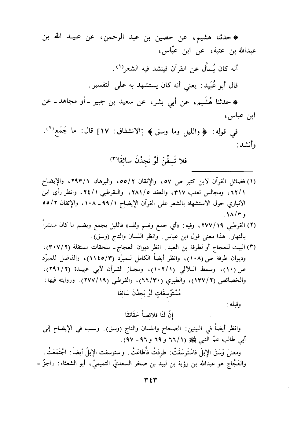 حَدَّثَنَا هُشَيْمٌ، عَنْ حُصَيْنِ بْنِ عَبْدِ الرَّحْمَنِ، عَنْ عُبَيْدِ اللَّهِ بْنِ عَبْدِ اللَّهِ بْنِ عُتْبَةَ، عَنِ ابْنِ عَبَّاسٍ، أَنَّهُ كَانَ §يُسْأَلُ عَنِ الْقُرْآنِ، فَيُنْشِدُ فِيهِ الشَّعْرَ. قَالَ أَبُو عُبَيْدٍ: يَعْنِي أَنَّهُ كَانَ يَسْتَشْهِدُ بِهِ عَلَى التَّفْسِيرِ