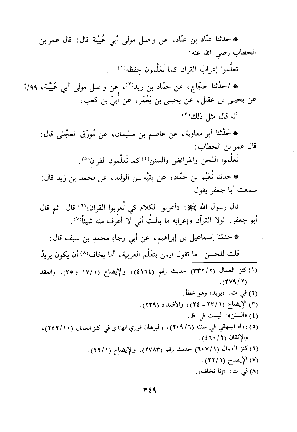 حَدَّثَنَا عَبَّادُ بْنُ عَبَّادٍ، عَنْ وَاصِلٍ مَوْلَى أَبِي عُيَيْنَةَ قَالَ: قَالَ عُمَرُ بْنُ الْخَطَّابِ رَضِيَ اللَّهُ عَنْهُ: §تَعَلَّمُوا إِعْرَابَ الْقُرْآنِ كَمَا تُعَلَّمُونَ حِفْظَهُ حَدَّثَنَا حَجَّاجٌ، عَنْ حَمَّادِ بْنِ زَيْدٍ، عَنْ وَاصِلٍ مَوْلَى أَبِي عُيَيْنَةَ، عَنْ يَحْيَى بْنِ عَقِيلٍ، عَنْ يَحْيَى بْنِ يَعْمَرَ، عَنْ أُبَيِّ بْنِ كَعْبٍ، أَنَّهُ قَالَ مِثْلَ ذَلِكَ