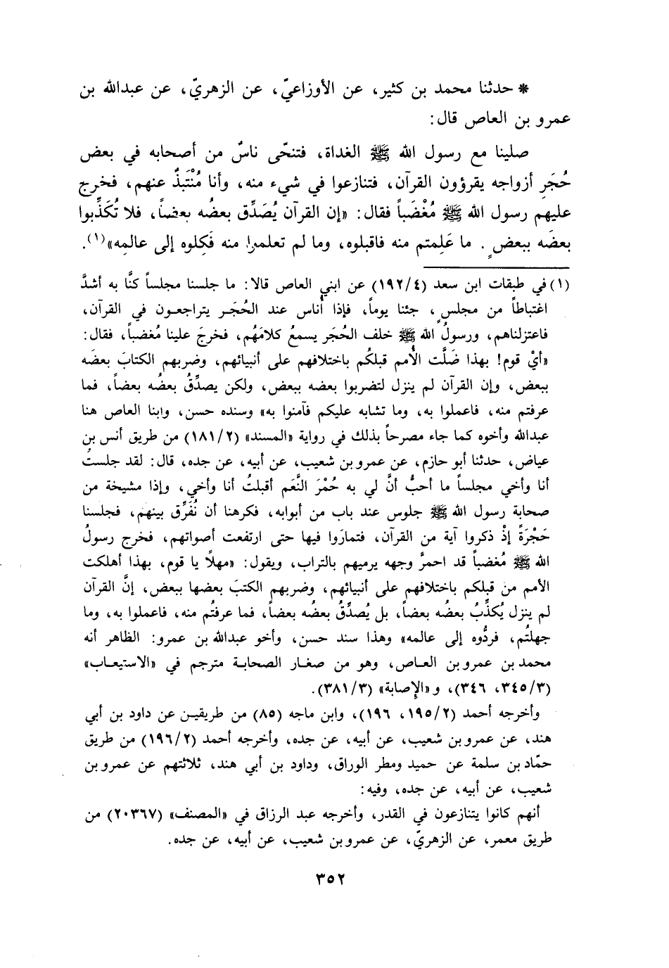 حَدَّثَنَا مُحَمَّدُ بْنُ كَثِيرٍ، عَنِ الْأَوْزَاعِيِّ، عَنِ الزُّهْرِيِّ، عَنِ عَبْدِ اللَّهِ بْنِ عَمْرِو بْنِ الْعَاصِ، قَالَ: صَلَّيْنَا مَعَ رَسُولِ اللَّهِ صَلَّى اللَّهُ عَلَيْهِ وَسَلَّمَ الْغَدَاةَ، فَتَنَحَّى نَاسٌ مِنْ أَصْحَابِهِ فِي بَعْضِ حُجَرِ أَزْوَاجِهِ يَقْرَءُونَ الْقُرْآنَ، فَتَنَازَعُوا فِي شَيْءٍ مِنْهُ، وَأَنَا مُنْتَبِذٌ عَنْهُمْ، فَخَرَجَ عَلَيْهِمْ رَسُولُ اللَّهِ صَلَّى اللَّهُ عَلَيْهِ وَسَلَّمَ مُغْضَبًا فَقَالَ: «§إِنَّ الْقُرْآنَ يُصَدِّقُ بَعْضُهُ بَعْضًا، فَلَا تُكَذِّبُوا بَعْضَهُ بِبَعْضٍ. مَا عَلِمْتُمْ مِنْهُ فَاقْبَلُوهُ، وَمَا لَمْ تَعَلَّمُوا مِنْهُ فَكُلُوهُ إِلَى عَالِمِهِ» -[353]- قَالَ: قَالَ عَبْدُ اللَّهِ بْنُ عَمْرٍو فَمَا اغْتَبَطَتْ نَفْسِي بِشَيْءٍ اغْتِبَاطِي بِانْتِبَاذِي عَنْهُمْ إِذْ لَمْ تُصِبْنِي عُتْبَى رَسُولِ اللَّهِ صَلَّى اللَّهُ عَلَيْهِ وَسَلَّمَ. حَدَّثَنِي أَبُو الْيَمَانِ، عَنْ شُعَيْبِ بْنِ أَبِي حَمْزَةَ، عَنِ ابْنِ شِهَابٍ، قَالَ: حَدَّثَنِي عَمْرُو بْنُ شُعَيْبِ بْنِ مُحَمَّدِ بْنِ عَبْدِ اللَّهِ بْنِ عَمْرٍو، أَنَّ عَبْدَ اللَّهِ بْنَ عَمْرٍو، قَالَ: صَلَّيْتُ مَعَ رَسُولِ اللَّهِ صَلَّى اللَّهُ عَلَيْهِ وَسَلَّمَ، فَجَلَسْتُ نَاحِيَةً، ثُمَّ ذَكَرَ مِثْلَ حَدِيثِ ابْنِ كَثِيرٍ عَنِ الْأَوْزَاعِيِّ. حَدَّثَنَا عَبْدُ اللَّهِ بْنُ صَالِحٍ، عَنِ اللَّيْثِ، عَنْ عَقِيلٍ، عَنِ ابْنِ شِهَابٍ، عَمَّنْ لَا نَتَّهِمُ، عَنْ عَبْدِ اللَّهِ بْنِ عَمْرٍو، عَنِ النَّبِيِّ صَلَّى اللَّهُ عَلَيْهِ وَسَلَّمَ، مِثْلَ ذَلِكَ. حَدَّثَنِي ابْنُ أَبِي عَدِيٍّ، عَنْ حُسَيْنٍ الْمُعَلِّمِ، عَنْ عَمْرِو بْنِ شُعَيْبٍ، عَنْ أَبِيهِ، عَنْ جَدِّهِ، عَنْ عَبْدِ اللَّهِ بْنِ عَمْرٍو، عَنِ النَّبِيِّ صَلَّى اللَّهُ عَلَيْهِ وَسَلَّمَ: مِثْلَ ذَلِكَ