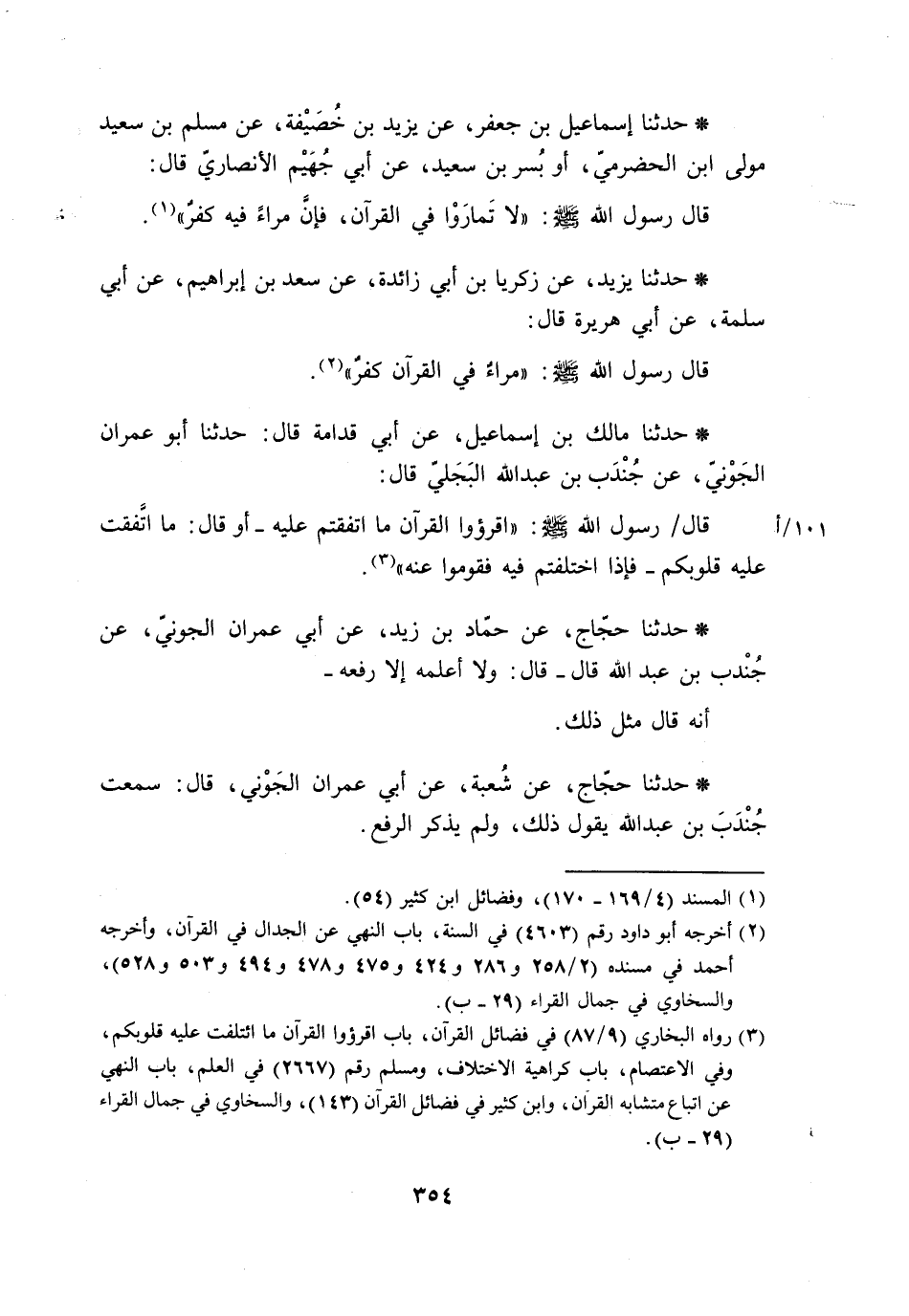 حَدَّثَنَا إِسْمَاعِيلُ بْنُ جَعْفَرٍ، عَنْ يَزِيدَ بْنِ خُصَيْفَةَ، عَنْ مُسْلِمِ بْنِ سَعِيدٍ مَوْلَى ابْنِ الْحَضْرَمِيِّ، أَوْ بُسْرِ بْنِ سَعِيدٍ، عَنْ أَبِي جُهَيْمٍ الْأَنْصَارِيِّ، قَالَ: قَالَ رَسُولُ اللَّهِ صَلَّى اللَّهُ عَلَيْهِ وَسَلَّمَ: «§لَا تَمَارَوْا فِي الْقُرْآنِ، فَإِنَّ مِرَاءً فِيهِ كُفْرٌ»