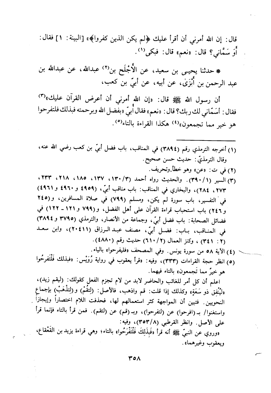 حَدَّثَنَا يَحْيَى بْنُ سَعِيدٍ، عَنِ الْأَجْلَحَ بْنِ عَبْدِ اللَّهِ، عَنْ عَبْدِ اللَّهِ بْنِ عَبْدِ الرَّحْمَنِ بْنِ أَبْزَى، عَنْ أَبِيهِ، عَنْ أُبَيِّ بْنِ كَعْبٍ، أَنَّ رَسُولَ اللَّهِ صَلَّى اللَّهُ عَلَيْهِ وَسَلَّمَ قَالَ: «§إِنَّ اللَّهَ أَمَرَنِي أَنْ أَعْرِضَ الْقُرْآنَ عَلَيْكَ» فَقَالَ: أَسَمَّانِي لَكَ ربُّكَ؟ قَالَ: «نَعَمْ» فَقَالَ أُبَيُّ: (بِفَضْلِ اللَّهِ وَبِرَحْمَتِهِ فَبِذَلِكَ فَلْتَفْرَحُوا هُوَ خَيْرٌ مِمَّا تَجْمَعُونَ) هَكَذَا الْقِرَاءَةُ بِالتَّاءِ. -[359]- قَالَ أَبُو عُبَيْدٍ: مَعْنَى هَذَا الْحَدِيثِ عِنْدَنَا أَنَّ رَسُولَ اللَّهِ صَلَّى اللَّهُ عَلَيْهِ وَسَلَّمَ إِنَّمَا أَرَادَ بِذَلِكَ الْعَرْضِ عَلَى أُبَيٍّ أَنْ يَتَعَلَّمَ مِنْهُ الْقِرَاءَةَ، وَيَسْتَثْبِتُ فِيهَا، وَلِيَكُونَ عَرْضُ الْقُرْآنِ سُنَّةً، وَلَيْسَ هَذَا عَلَى أَنْ يَسْتَذْكِرَ النَّبِيُّ صَلَّى اللَّهُ عَلَيْهِ وَسَلَّمَ مِنْهُ شَيْئًا بِذَلِكَ الْعَرْضِ