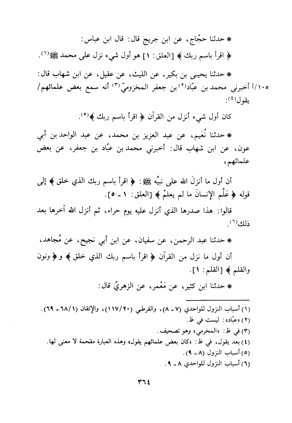 حَدَّثَنَا يَحْيَى بْنُ بُكَيْرٍ، عَنِ اللَّيْثِ، عَنْ عَقِيلٍ، عَنِ ابْنِ شِهَابٍ، قَالَ: أَخْبَرَنِي مُحَمَّدُ بْنُ عَبَّادِ بْنِ جَعْفَرٍ الْمَخْزُومِيِّ، أَنَّهُ سَمِعَ بَعْضَ عُلَمَائِهِمْ يَقُولُ: §كَانَ أَوَّلُ شَيْءٍ أُنْزِلَ مِنَ الْقُرْآنِ اقْرَأْ بِاسْمِ رَبِّكَ