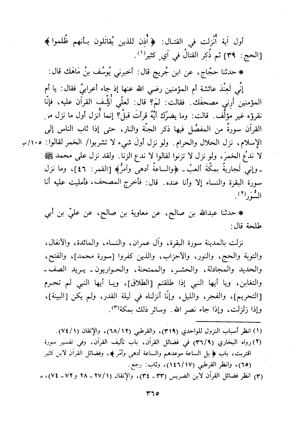 حَدَّثَنَا عَبْدُ اللَّهِ بْنُ صَالِحٍ، عَنْ مُعَاوِيَةَ بْنِ صَالِحٍ، عَنْ عَلِيِّ بْنِ أَبِي طَلْحَةَ، قَالَ: §نَزَلَتْ بِالْمَدِينَةِ سُورَةُ الْبَقَرَةِ، وَآلِ عِمْرَانَ، وَالنِّسَاءِ، وَالْمَائِدَةِ، وَالْأَنْفَالِ، وَالتَّوْبَةِ، وَالْحَجِّ، وَالنُّورِ، وَالْأَحْزَابِ، وَالَّذِينَ كَفَرُوا، وَالْفَتْحِ، وَالْحَدِيدِ، وَالْمُجَادَلَةِ، وَالْحَشْرِ، وَالْمُمْتَحَنَةِ، وَالْحَوَارِيُّونَ يُرِيدُ الصَّفَّ وَالتَّغَابُنِ، وَيَا أَيُّهَا النَّبِيُّ إِذَا طَلَّقْتُمْ، وَيَا أَيُّهَا النَّبِيُّ لِمَ تُحَرِّمُ، وَالْفَجْرِ، وَاللَّيْلِ، وَإِنَّا أَنْزَلْنَاهُ فِي لَيْلَةِ الْقَدْرِ، وَلَمْ يَكُنْ، وَإِذَا زُلْزِلَتْ، وَإِذَا جَاءَ نَصْرُ اللَّهِ؛ وَسَائِرُ ذَلِكَ بِمَكَّةَ